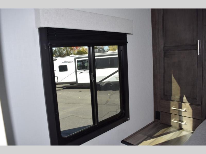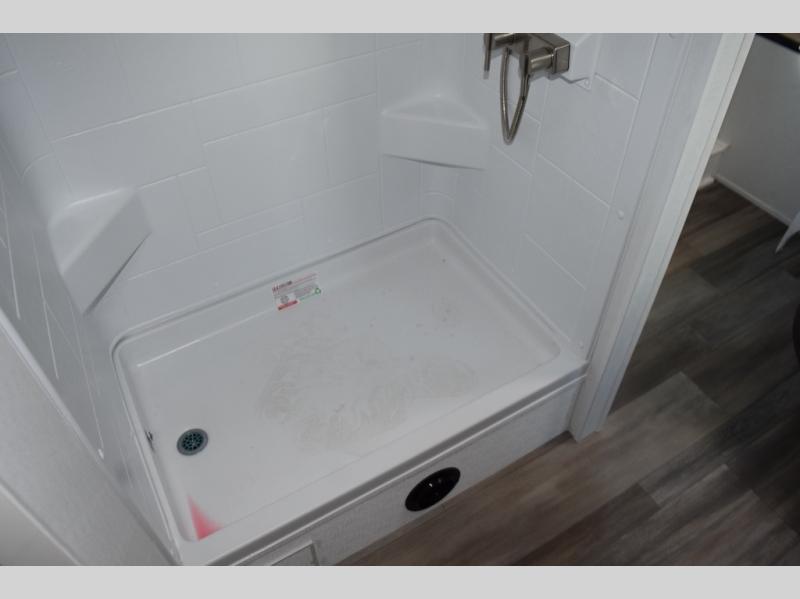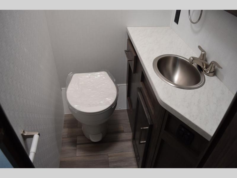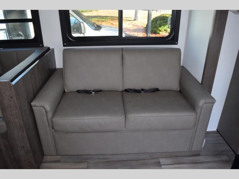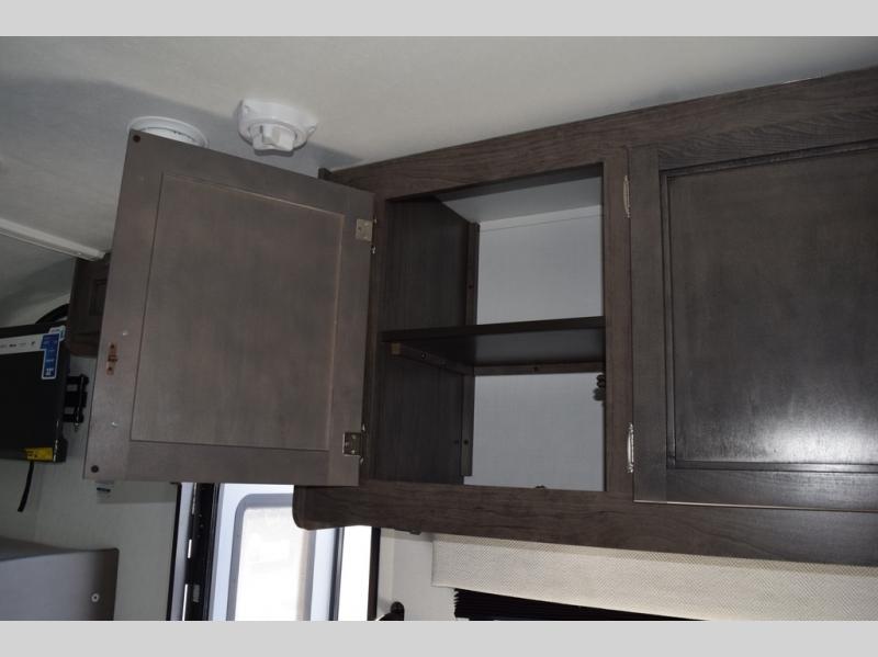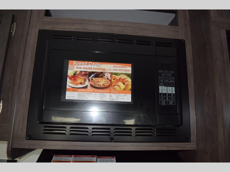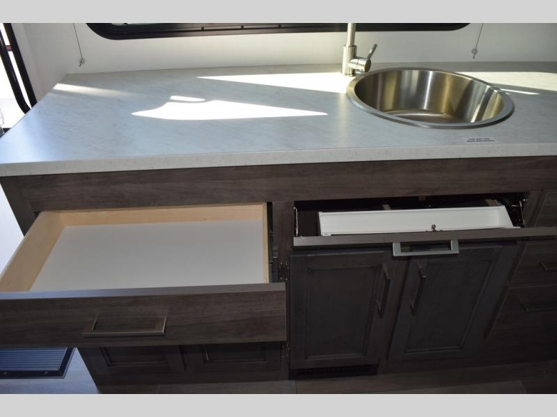 As you step inside, you’re greeted by a cozy cab-over bunk, perfect for accommodating an extra guest in comfort. The slide-out provides ample living space and houses a 42" x 74" U-dinette, ideal for enjoying meals, playing board games, or simply gathering with friends and family. Also, in the slide-out is a 60" jack-knife sofa, offering a comfortable place to relax, and both the dinette and sofa can easily convert into additional sleeping space if needed. Across from the living area, the well-equipped kitchen includes a stainless-steel sink, a convection microwave oven, a two-burner cooktop with flush cover, and a 10-cu. ft. refrigerator, giving you everything you need to cook with ease while on the road. The bathroom provides a 24" x 36" shower and a foot-flush toilet for added convenience. At the rear, the private bedroom offers a 60" x 74" queen bed for restful sleep, along with a wardrobe and overhead cabinets to keep your clothing and essentials neatly organized.
