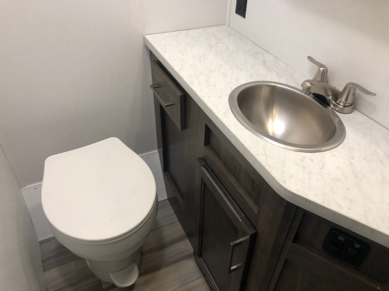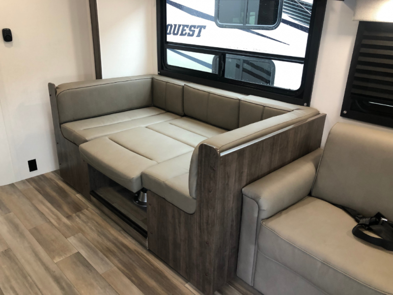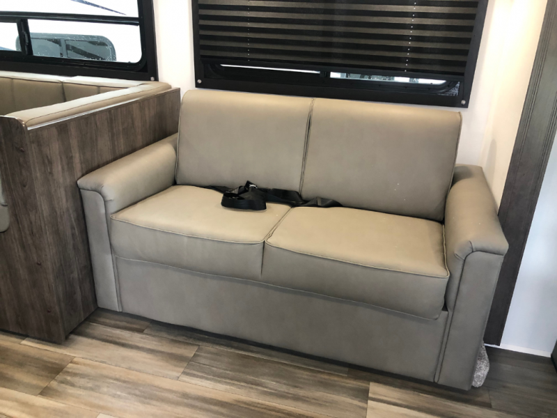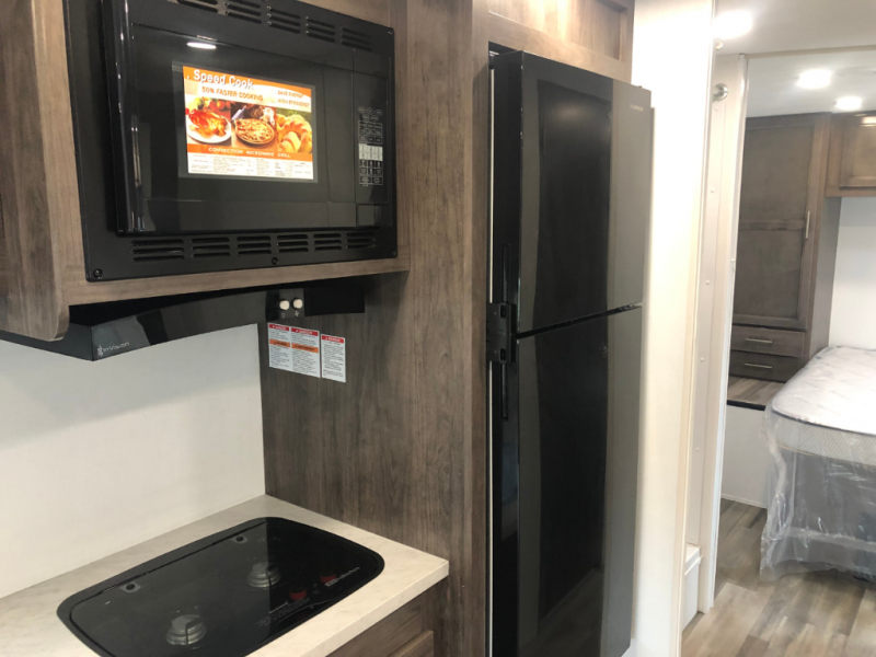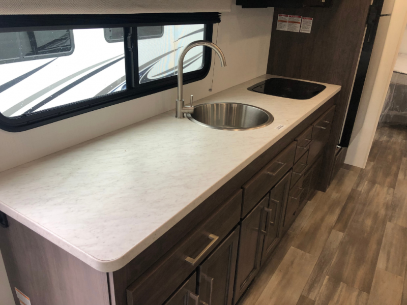 As you step inside, you’re greeted by a cozy cab-over bunk, perfect for accommodating an extra guest in comfort. The slide-out provides ample living space and houses a 42" x 74" U-dinette, ideal for enjoying meals, playing board games, or simply gathering with friends and family. Also, in the slide-out is a 60" jack-knife sofa, offering a comfortable place to relax, and both the dinette and sofa can easily convert into additional sleeping space if needed. Across from the living area, the well-equipped kitchen includes a stainless-steel sink, a convection microwave oven, a two-burner cooktop with flush cover, and a 10-cu. ft. refrigerator, giving you everything you need to cook with ease while on the road. The bathroom provides a 24" x 36" shower and a foot-flush toilet for added convenience. At the rear, the private bedroom offers a 60" x 74" queen bed for restful sleep, along with a wardrobe and overhead cabinets to keep your clothing and essentials neatly organized.