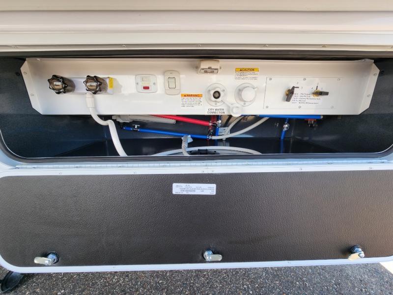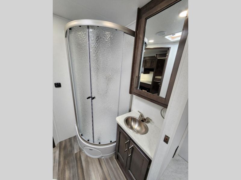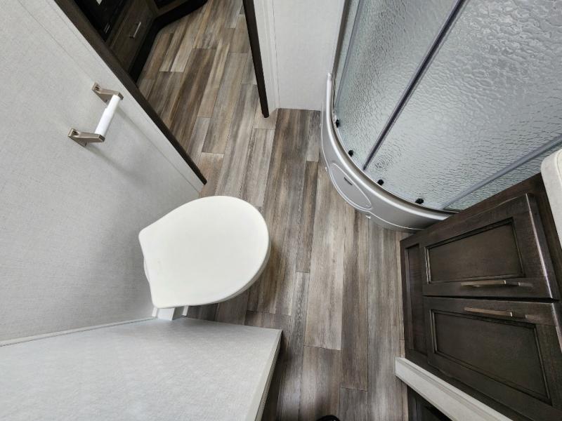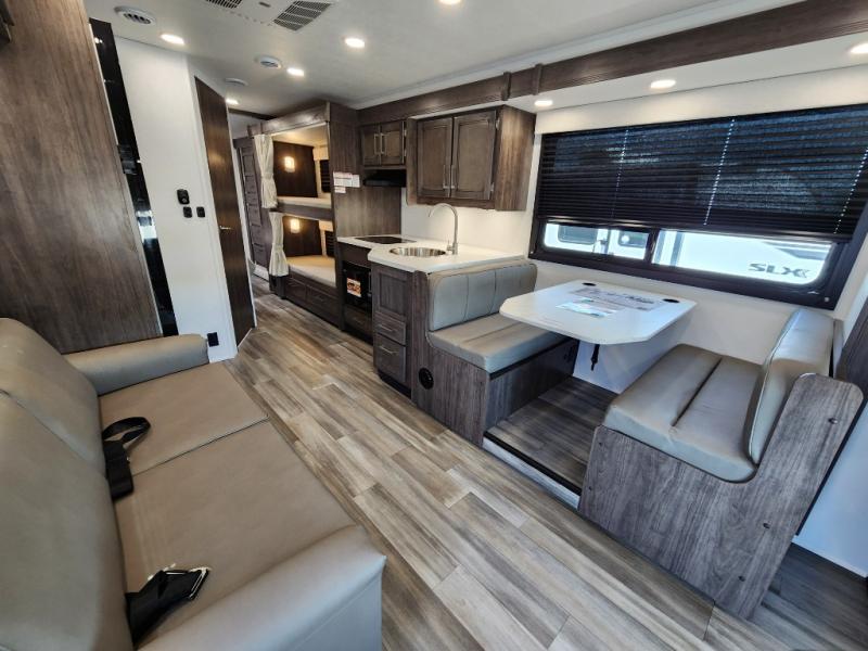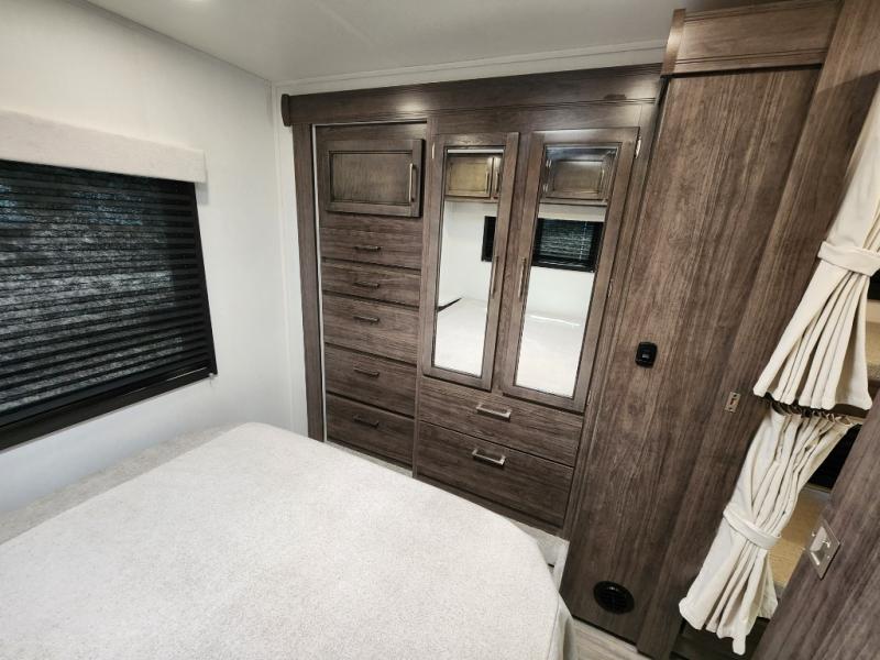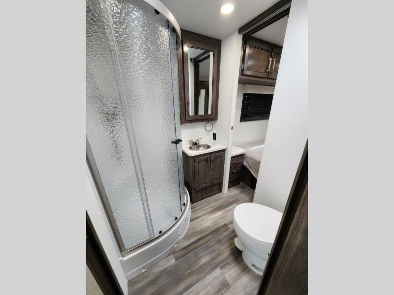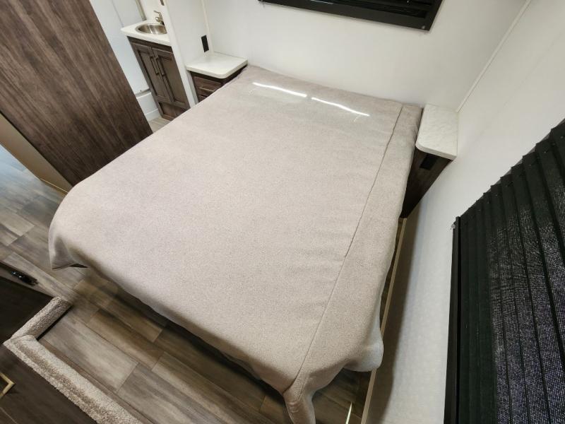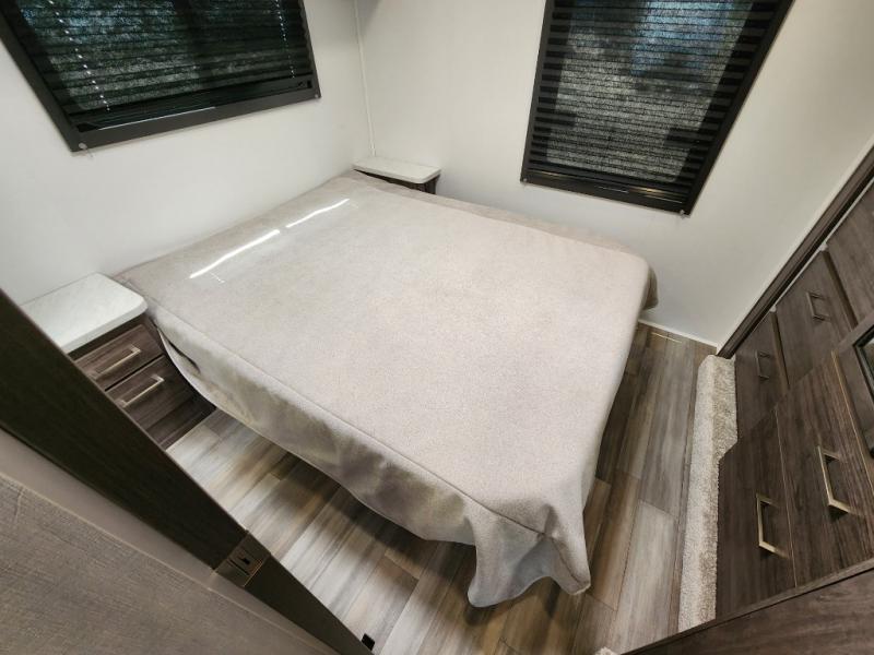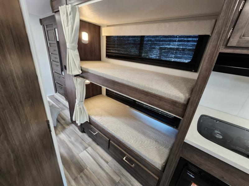 This coach will be perfect if you enjoy traveling with a larger group. Between the cab-over bunk and bunk beds, plus the RV queen bed and living area furniture, you can comfortably sleep eight! You can prepare meals for your crew on the two burner cooktop or in the convection microwave, and there is a 10 cu. ft. 12V refrigerator plus a pantry for food storage. The bunk beds are across from the dual entry bath for easy nighttime use, and you'll appreciate the rear private bedroom all to yourselves. Along with the RV queen bed, there is a wardrobe and drawers to keep shoes, clothes and more stored away!