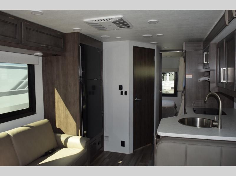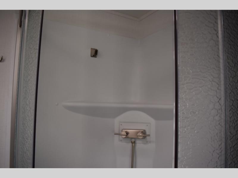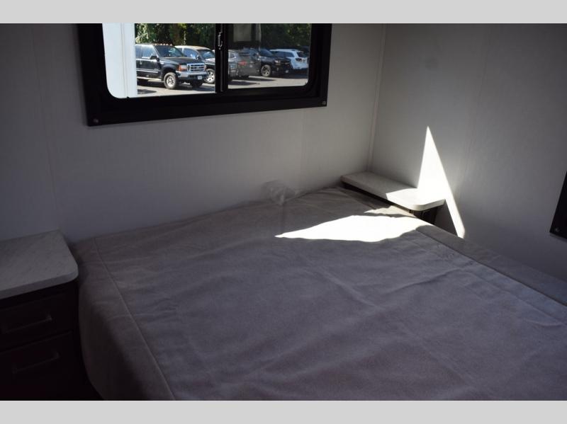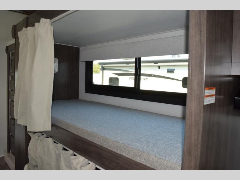 This coach will be perfect if you enjoy traveling with a larger group. Between the cab-over bunk and bunk beds, plus the RV queen bed and living area furniture, you can comfortably sleep eight! You can prepare meals for your crew on the two burner cooktop or in the convection microwave, and there is a 10 cu. ft. 12V refrigerator plus a pantry for food storage. The bunk beds are across from the dual entry bath for easy nighttime use, and you'll appreciate the rear private bedroom all to yourselves. Along with the RV queen bed, there is a wardrobe and drawers to keep shoes, clothes and more stored away!