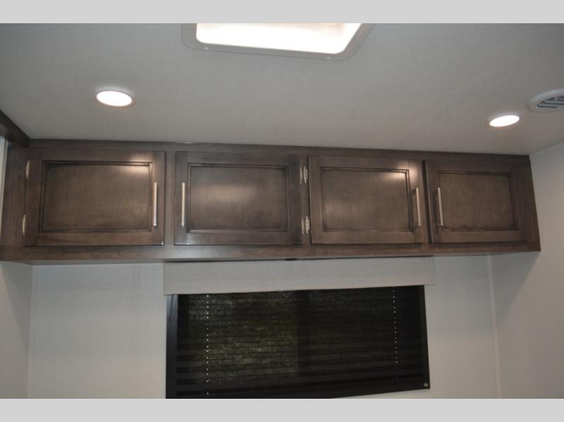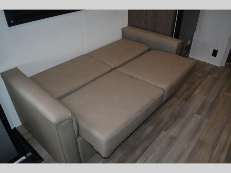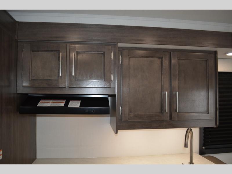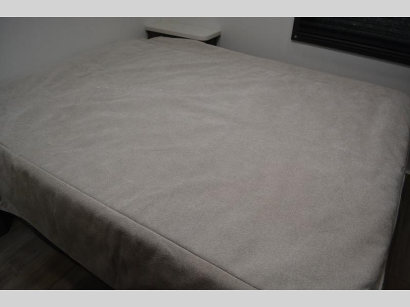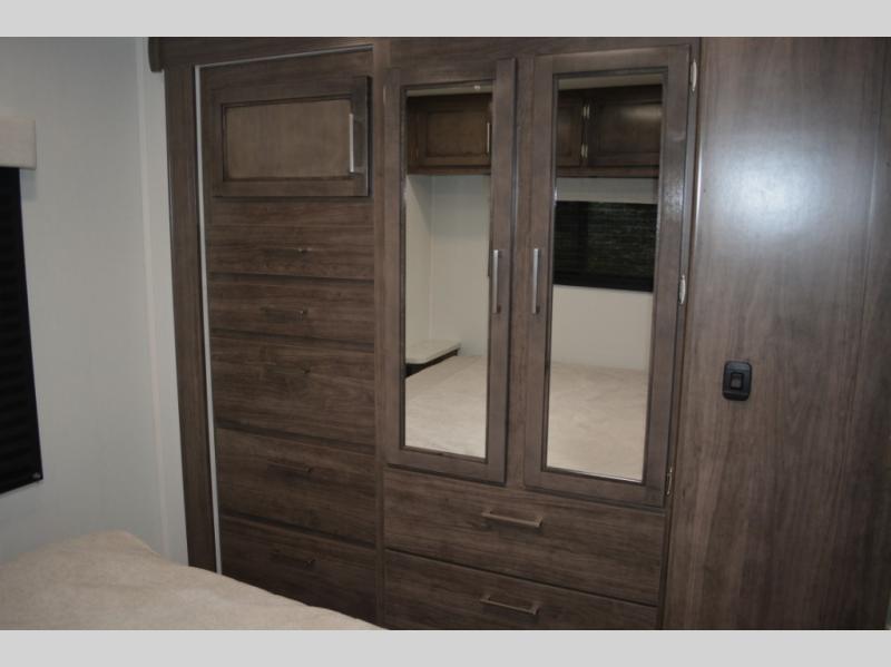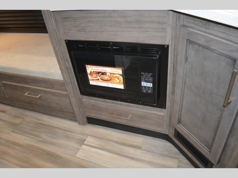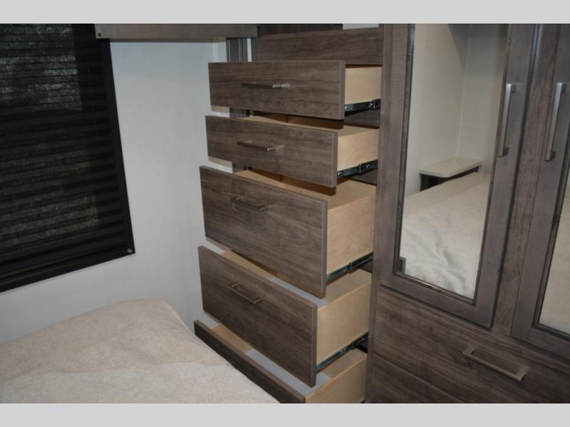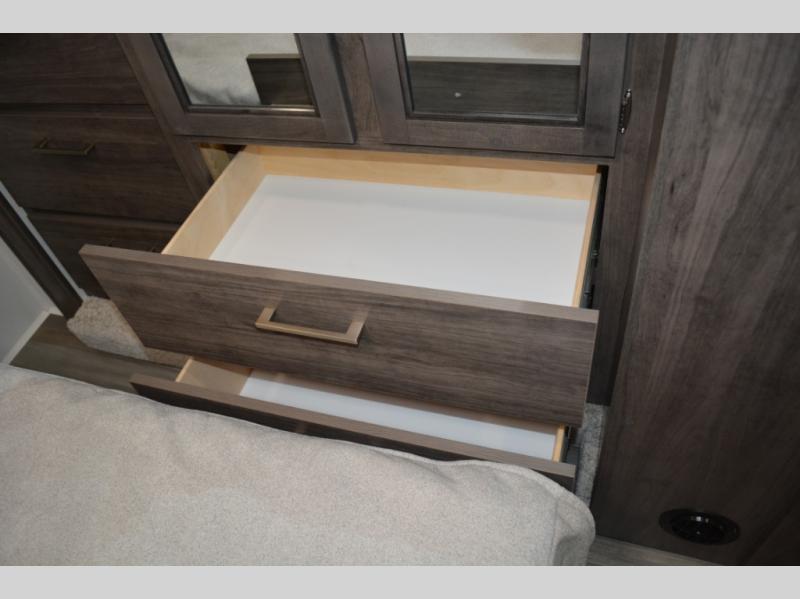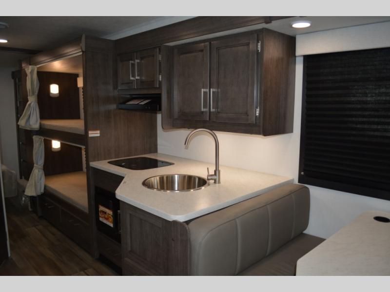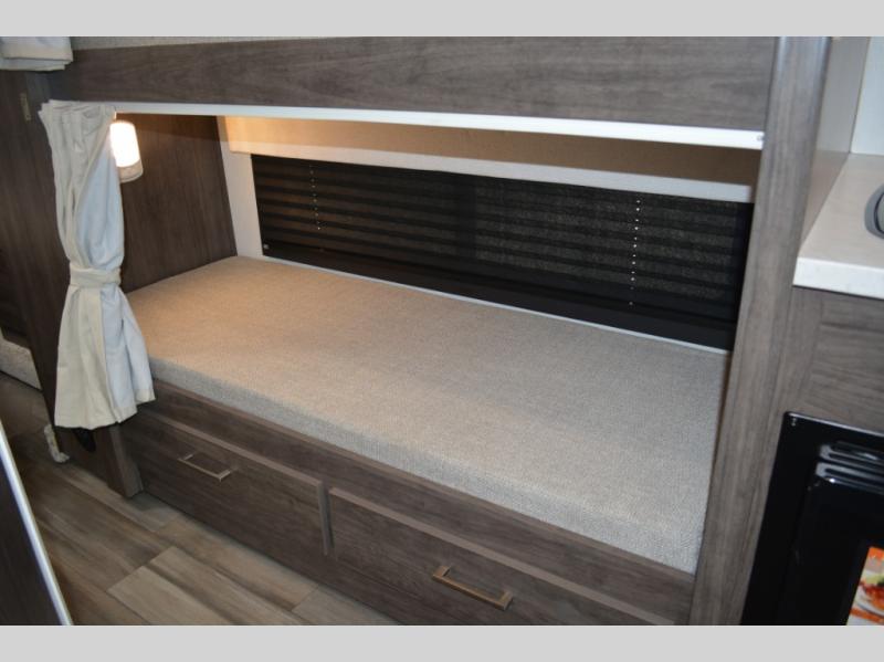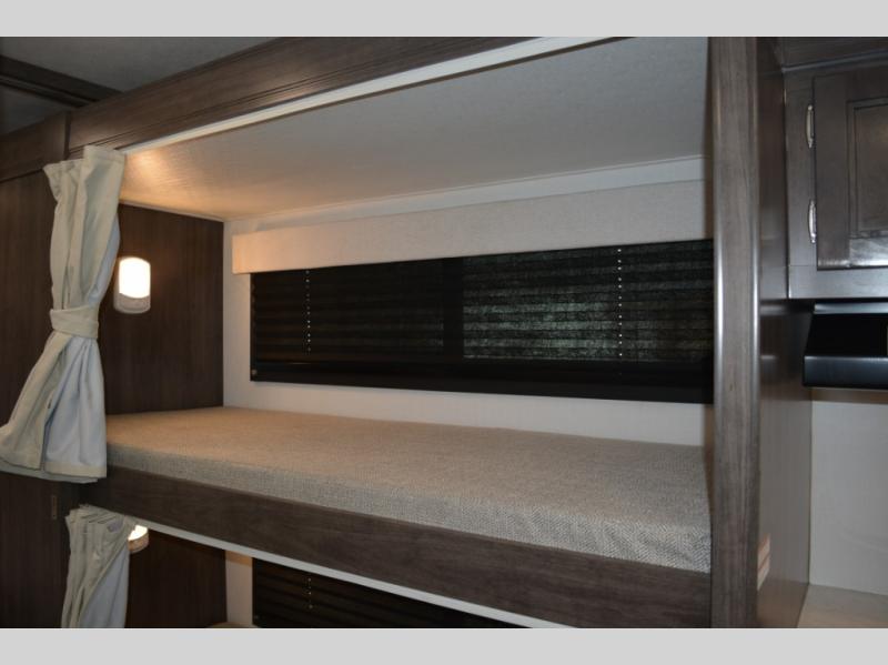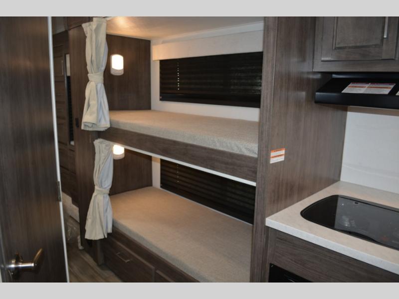 This coach will be perfect if you enjoy traveling with a larger group. Between the cab-over bunk and bunk beds, plus the RV queen bed and living area furniture, you can comfortably sleep eight! You can prepare meals for your crew on the two burner cooktop or in the convection microwave, and there is a 10 cu. ft. 12V refrigerator plus a pantry for food storage. The bunk beds are across from the dual entry bath for easy nighttime use, and you'll appreciate the rear private bedroom all to yourselves. Along with the RV queen bed, there is a wardrobe and drawers to keep shoes, clothes and more stored away!