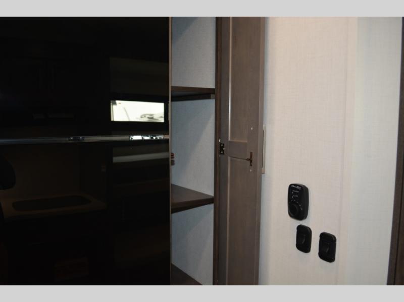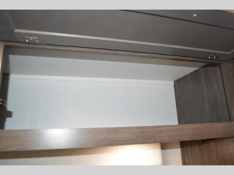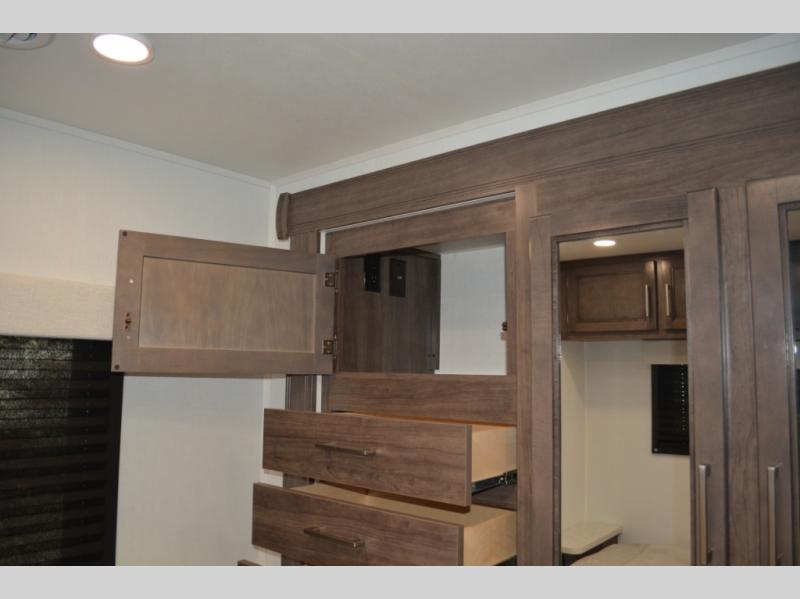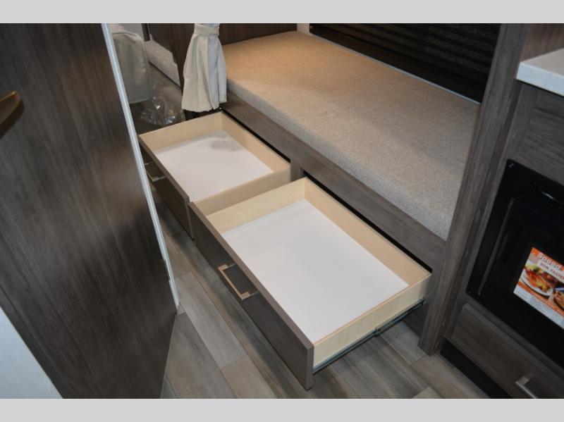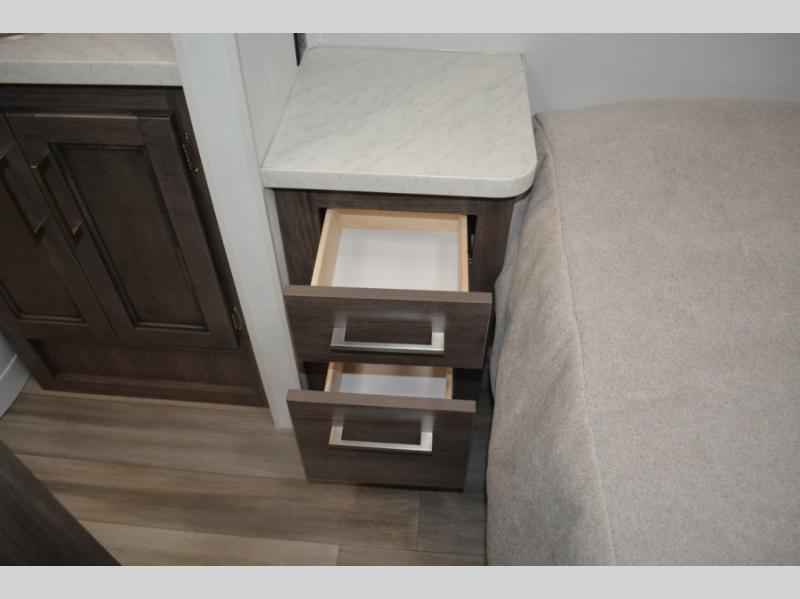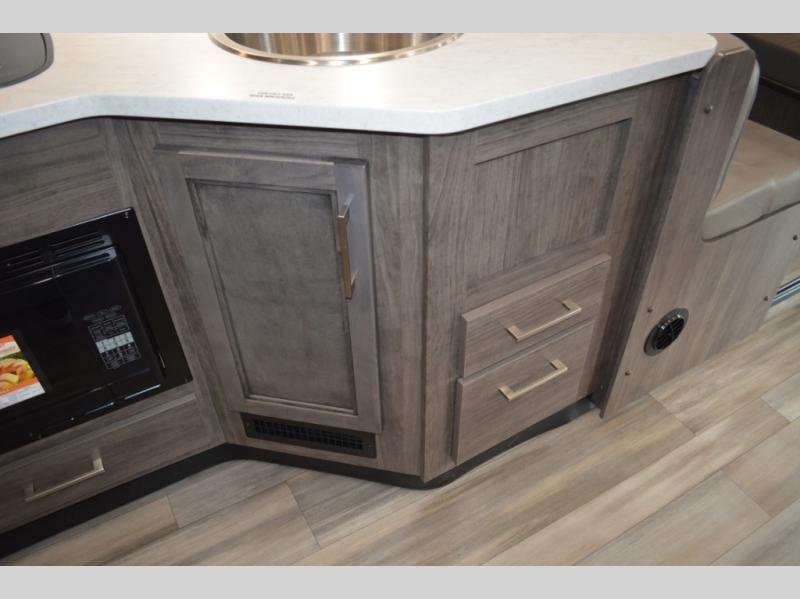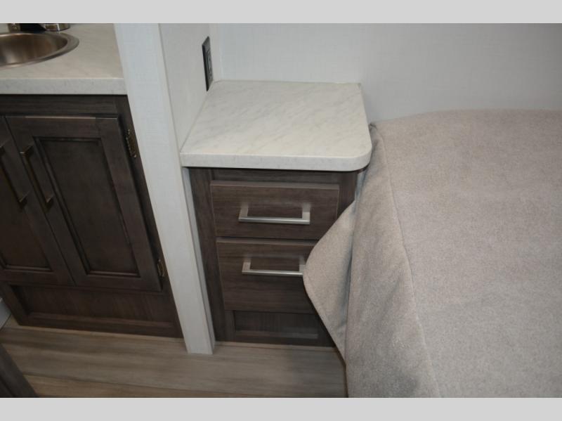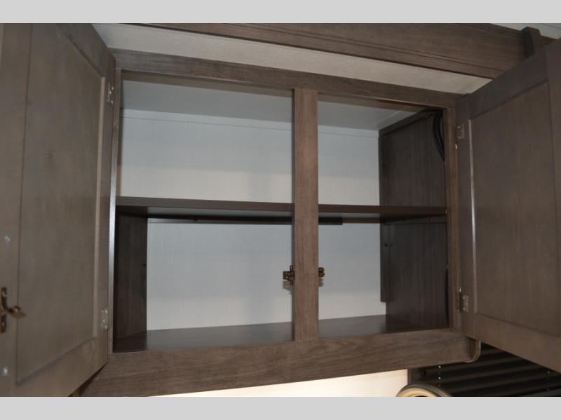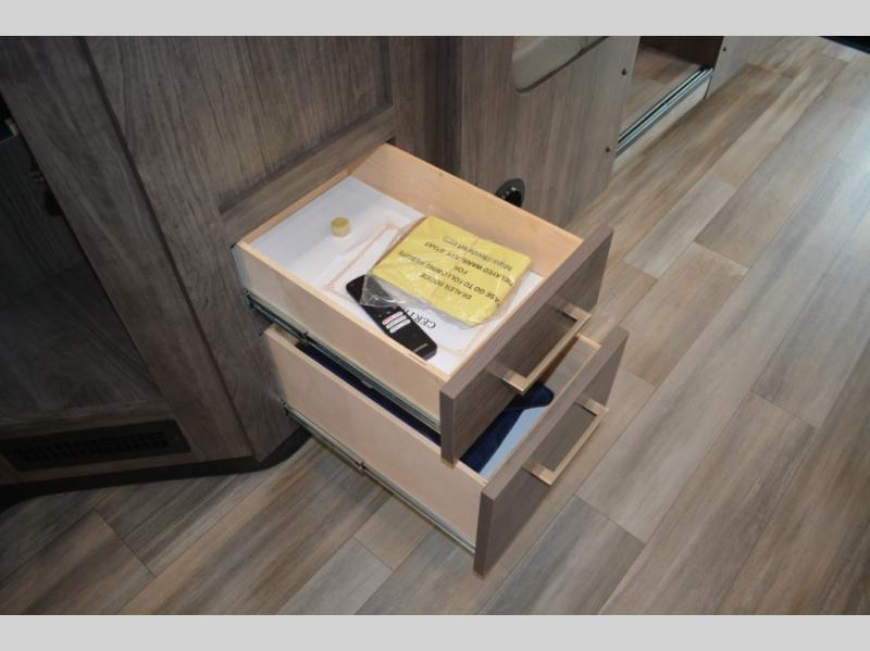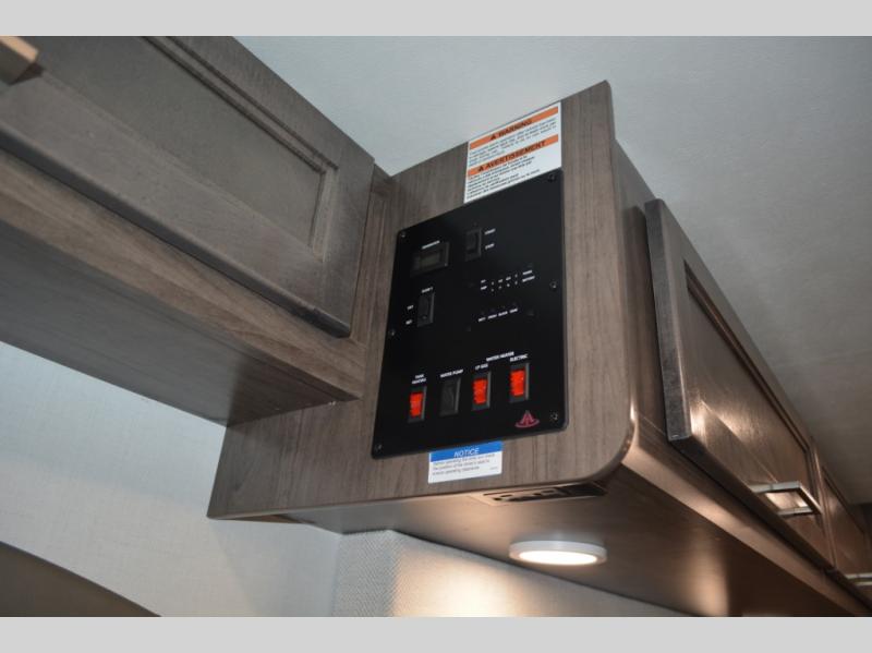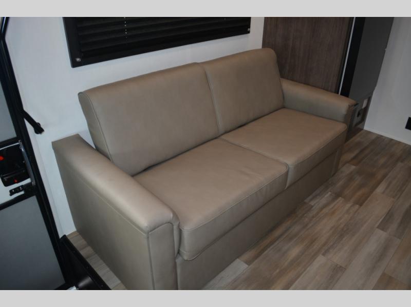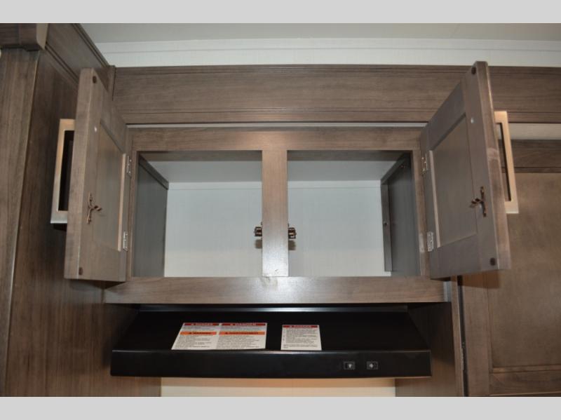 This coach will be perfect if you enjoy traveling with a larger group. Between the cab-over bunk and bunk beds, plus the RV queen bed and living area furniture, you can comfortably sleep eight! You can prepare meals for your crew on the two burner cooktop or in the convection microwave, and there is a 10 cu. ft. 12V refrigerator plus a pantry for food storage. The bunk beds are across from the dual entry bath for easy nighttime use, and you'll appreciate the rear private bedroom all to yourselves. Along with the RV queen bed, there is a wardrobe and drawers to keep shoes, clothes and more stored away!