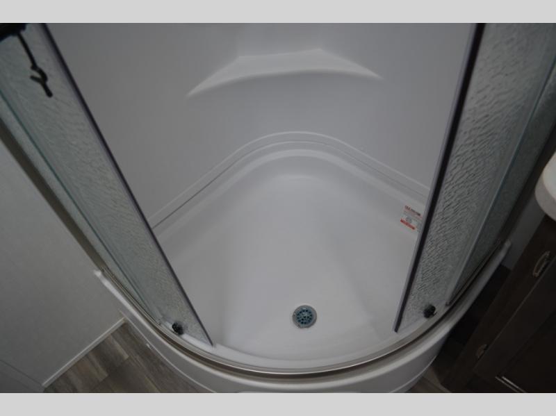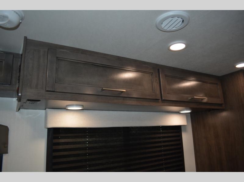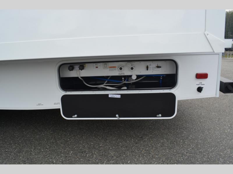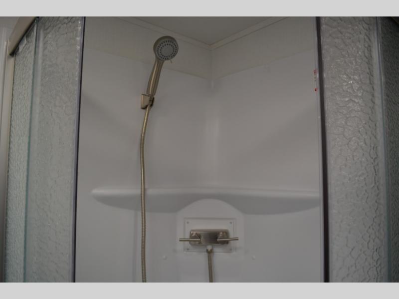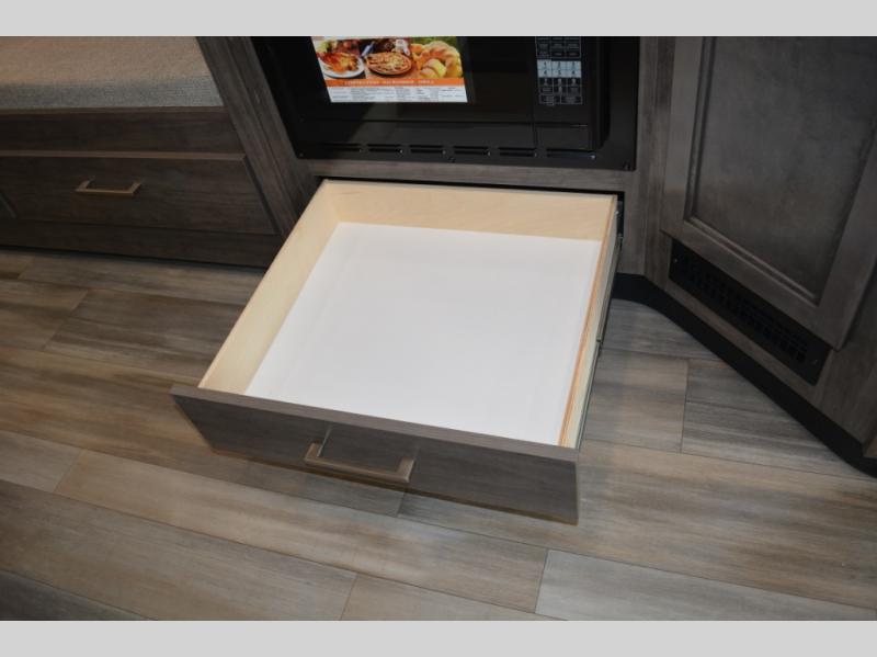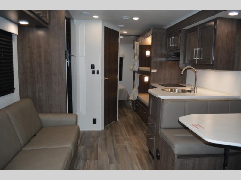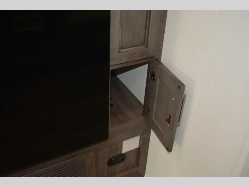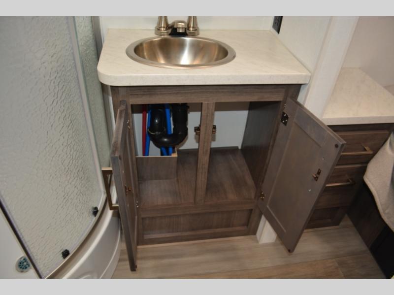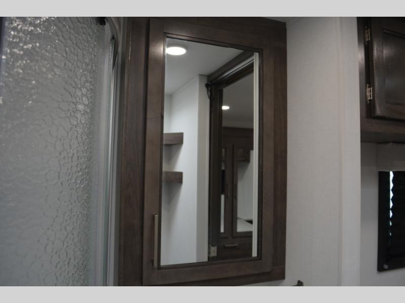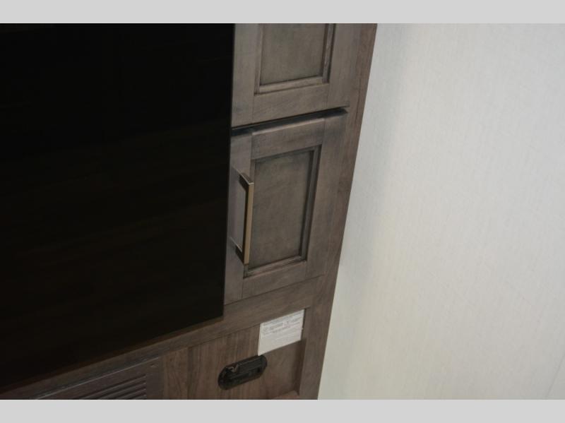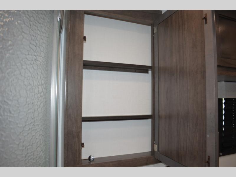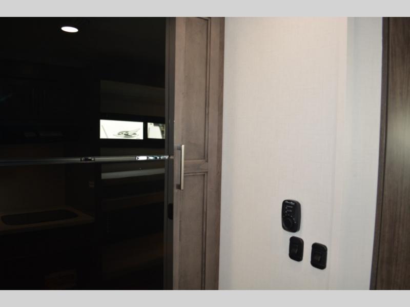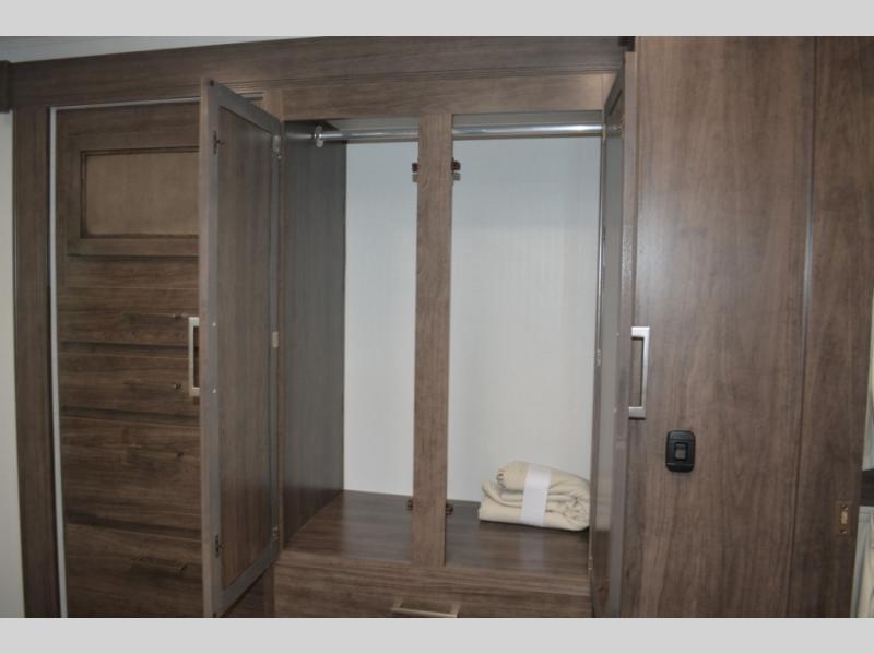 This coach will be perfect if you enjoy traveling with a larger group. Between the cab-over bunk and bunk beds, plus the RV queen bed and living area furniture, you can comfortably sleep eight! You can prepare meals for your crew on the two burner cooktop or in the convection microwave, and there is a 10 cu. ft. 12V refrigerator plus a pantry for food storage. The bunk beds are across from the dual entry bath for easy nighttime use, and you'll appreciate the rear private bedroom all to yourselves. Along with the RV queen bed, there is a wardrobe and drawers to keep shoes, clothes and more stored away!