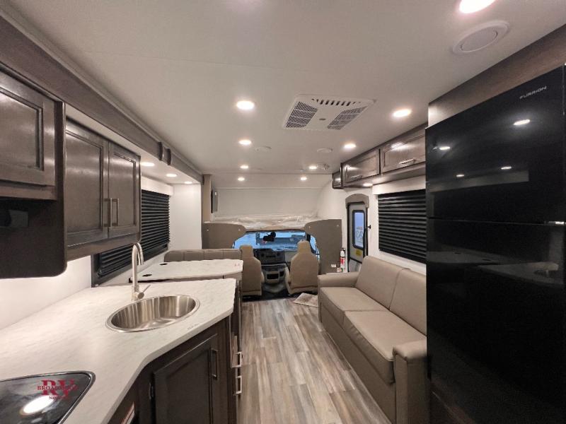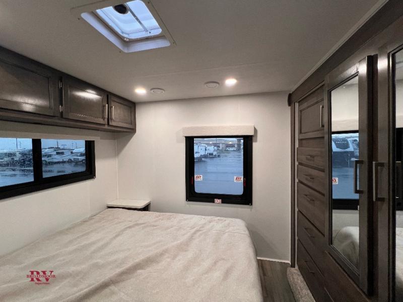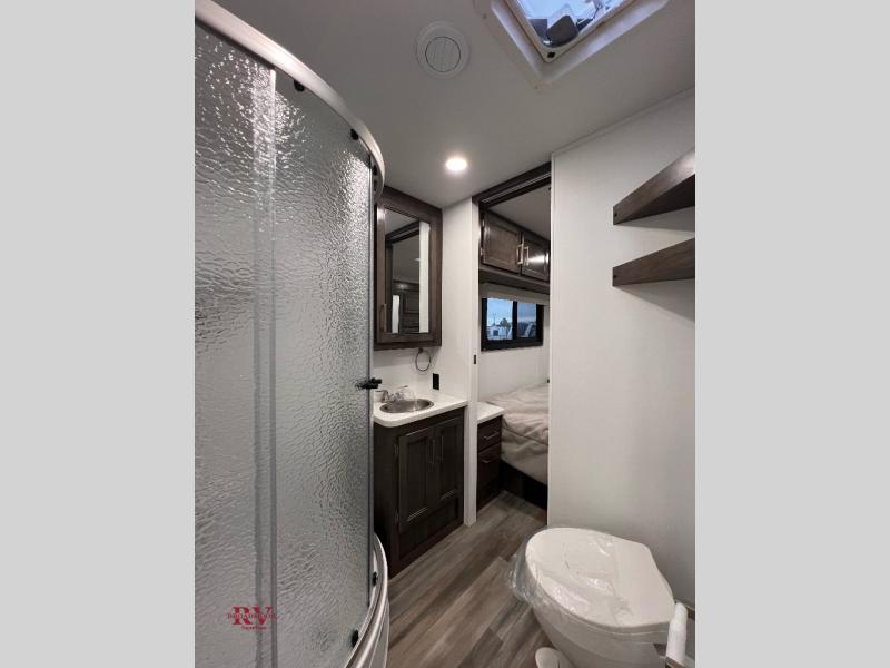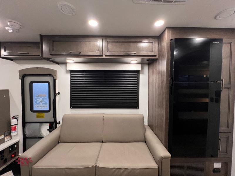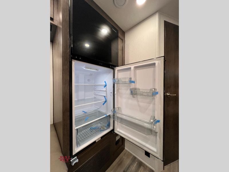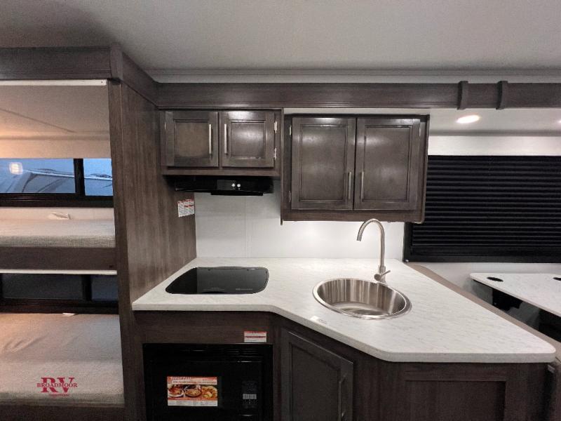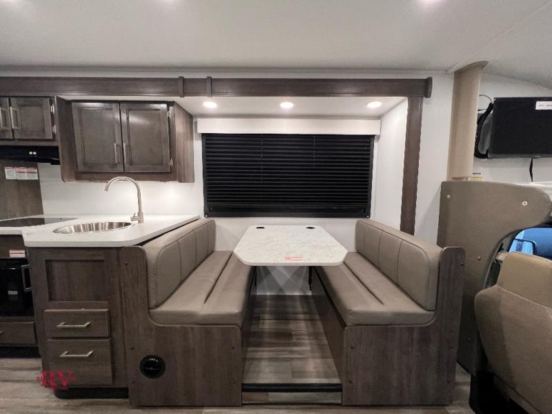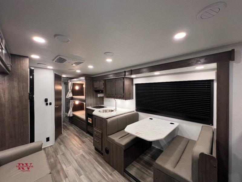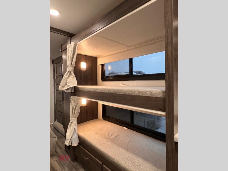 This coach will be perfect if you enjoy traveling with a larger group. Between the cab-over bunk and bunk beds, plus the RV queen bed and living area furniture, you can comfortably sleep eight! You can prepare meals for your crew on the two burner cooktop or in the convection microwave, and there is a 10 cu. ft. 12V refrigerator plus a pantry for food storage. The bunk beds are across from the dual entry bath for easy nighttime use, and you'll appreciate the rear private bedroom all to yourselves. Along with the RV queen bed, there is a wardrobe and drawers to keep shoes, clothes and more stored away!