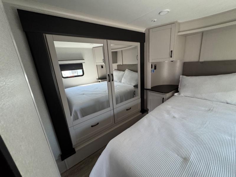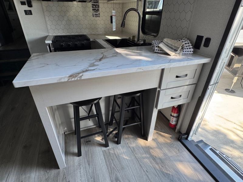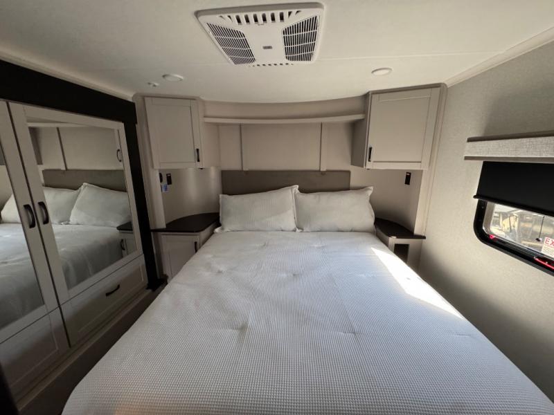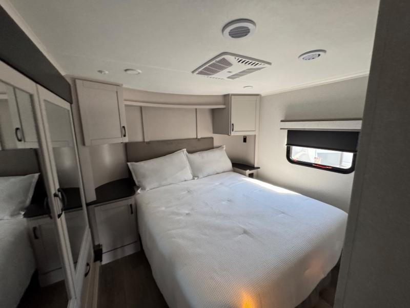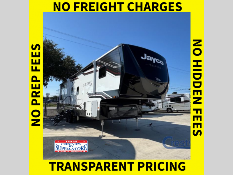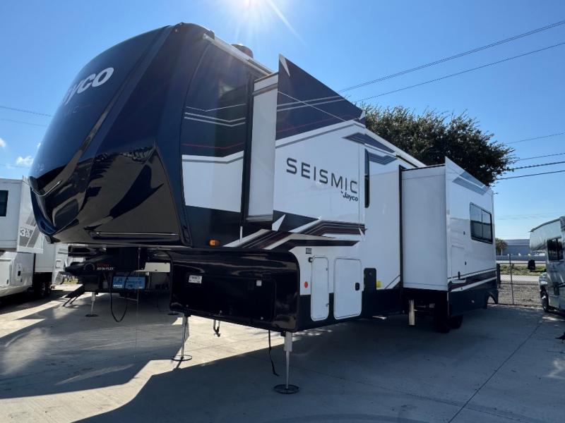 One look at the Seismic toy haulers by Jayco, and you'll never go back! Each model features a custom automotive-grade vinyl exterior graphics package, a painted fiberglass front cap with built-in LED lighting, and 102" wide-body structural steel I-beam construction. You'll find the pass-through storage with Slam-Latch baggage doors will make unpacking easier than ever, and the rear ramp door/patio with anti-slip, non-skid flooring will allow you to unload your toys with no trouble at all. These toy haulers feature a three seasons garage wall/doors, a 30 gallon fuel tank with a timer, and exterior marine-grade speakers to keep the party going. The Climate Shield zero degree tested weather protection includes a 35,000 BTU furnace, PEX plumbing, and a fully enclosed and heated underbelly so you can enjoy your adventures year around. And we haven't even touched on the interior luxuries you'll find, like solid hardwood cabinet doors, residential vinyl flooring made in the USA, night shades, and more!
