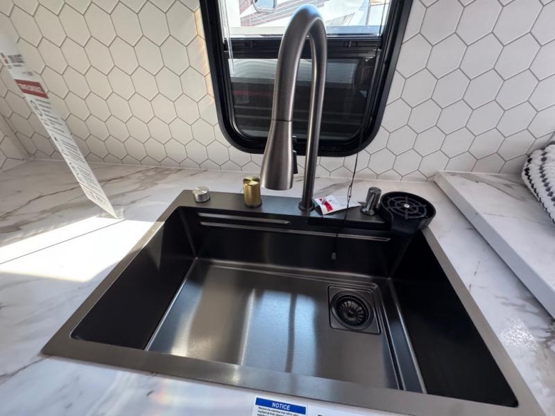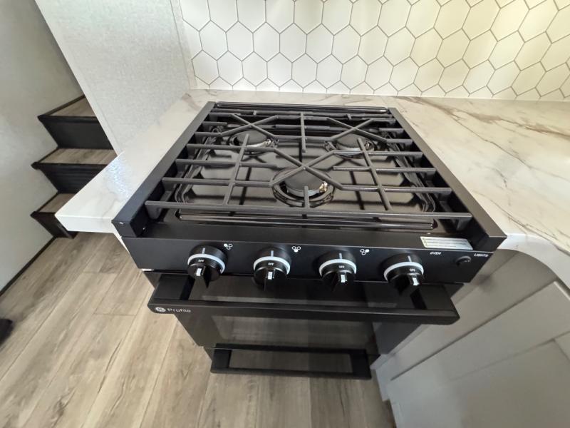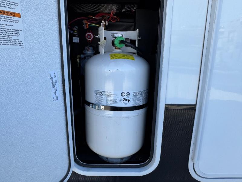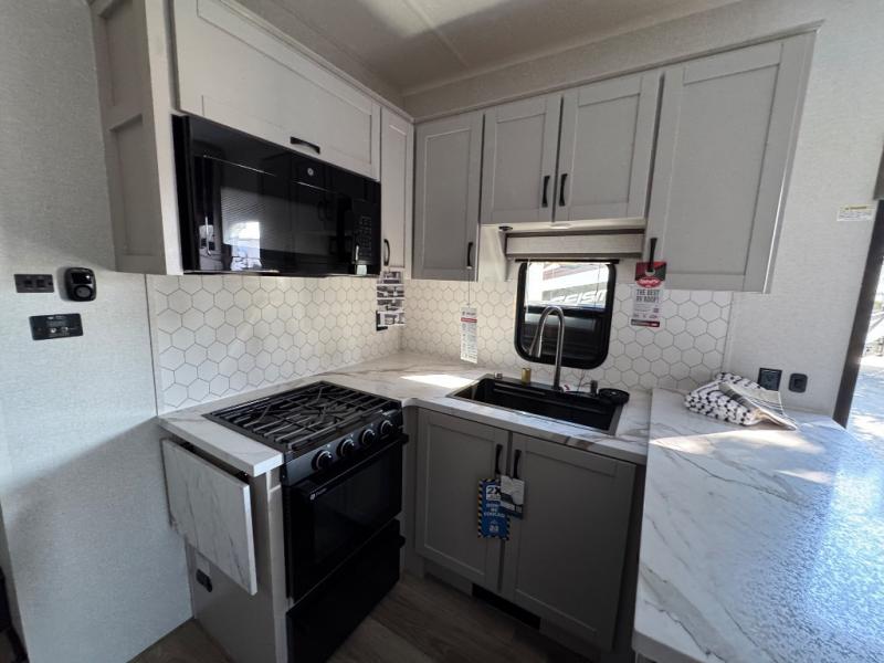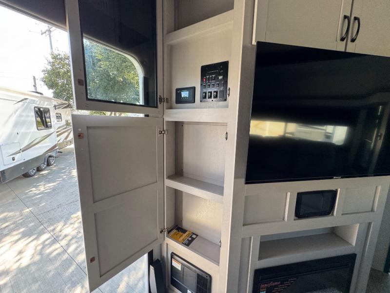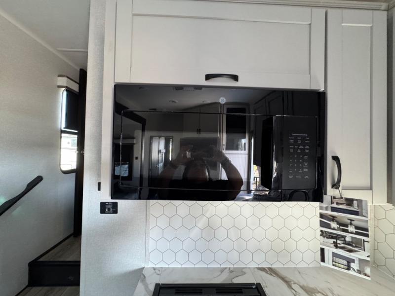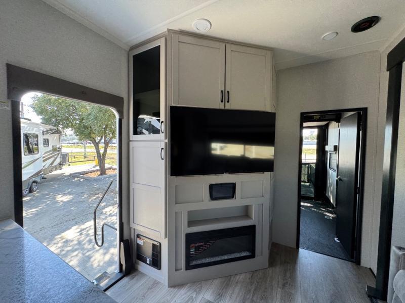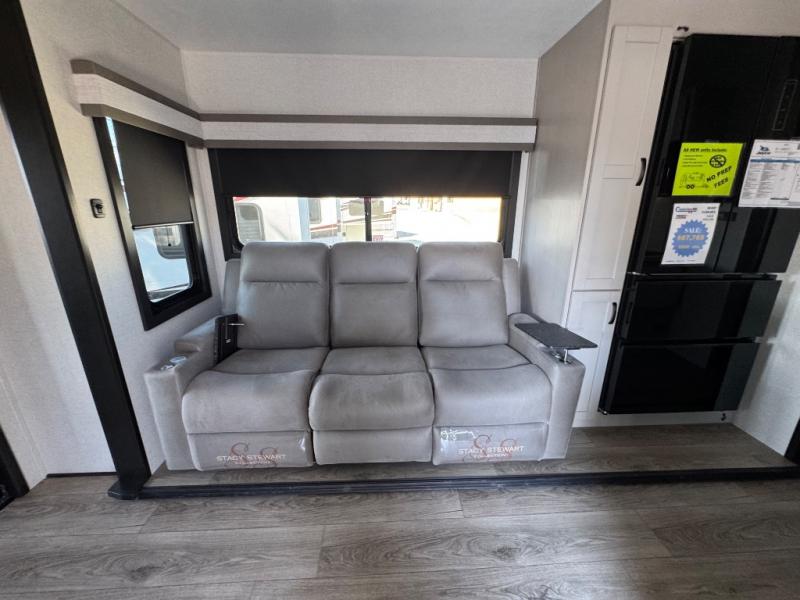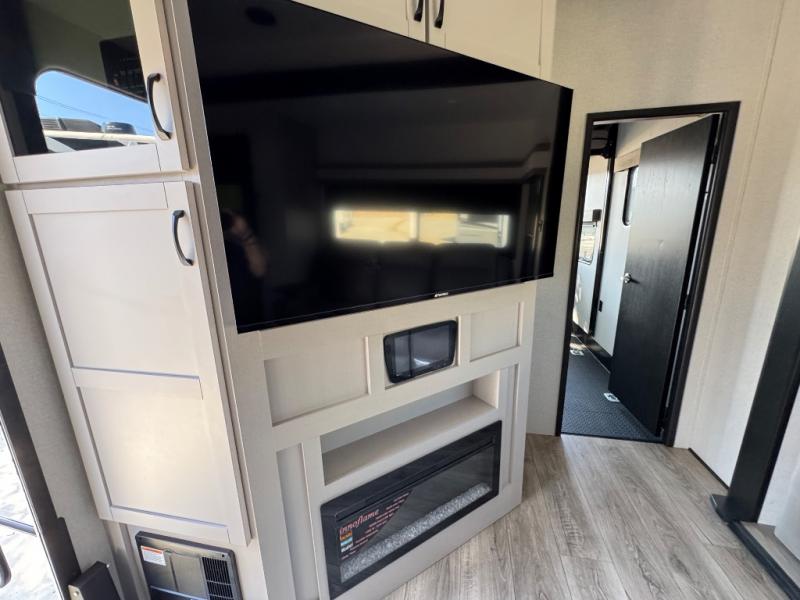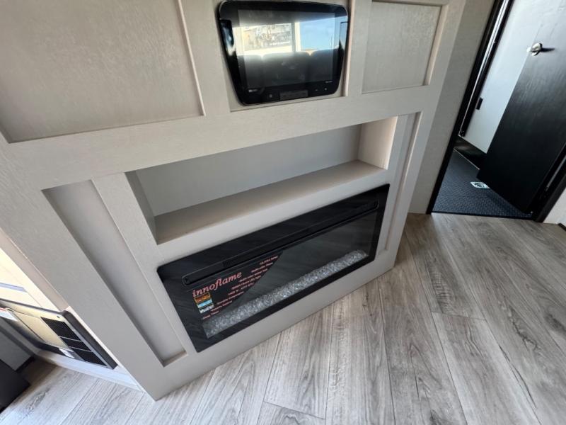 Get ready for outdoor adventures in this spacious toy hauler. Your guests will have the 11' separate garage area with its own half bath, a queen bed with rear convertible sofas, plus an overhead storage area for their things. The main living area includes a large slide out for added space, and here you can relax on the sofa that sits across from the entertainment center and fireplace. The chef will love the U-shaped kitchen counter, 17 cu. ft. 12V refrigerator, and residential oven with a three burner cooktop. You will feel right at home in the front private bedroom with its slide out wardrobe and king bed for all-around comfort.