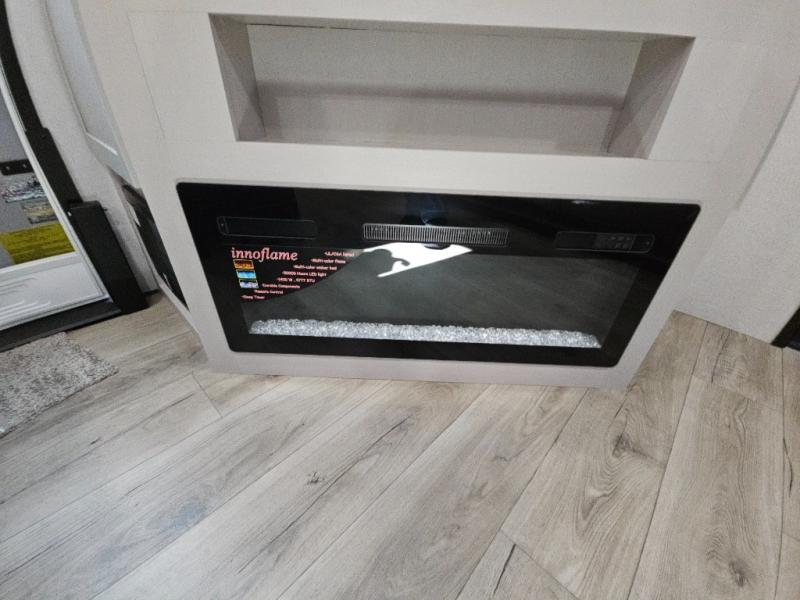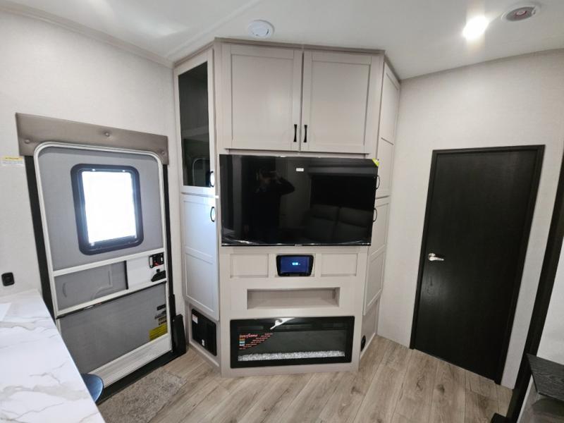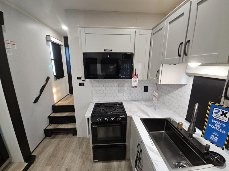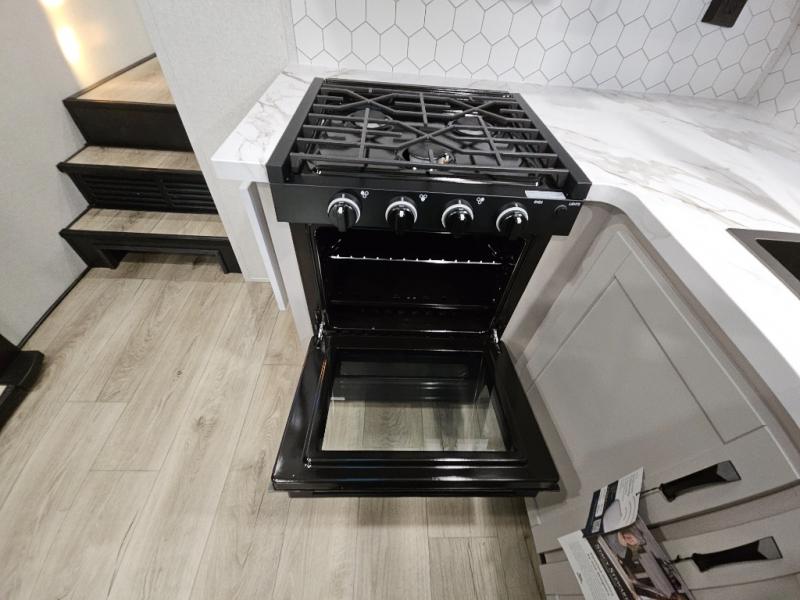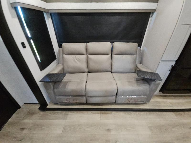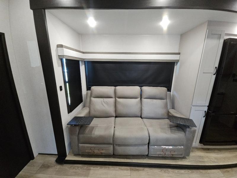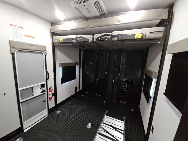 Get ready for outdoor adventures in this spacious toy hauler. Your guests will have the 11' separate garage area with its own half bath, a queen bed with rear convertible sofas, plus an overhead storage area for their things. The main living area includes a large slide out for added space, and here you can relax on the sofa that sits across from the entertainment center and fireplace. The chef will love the U-shaped kitchen counter, 17 cu. ft. 12V refrigerator, and residential oven with a three burner cooktop. You will feel right at home in the front private bedroom with its slide out wardrobe and king bed for all-around comfort.