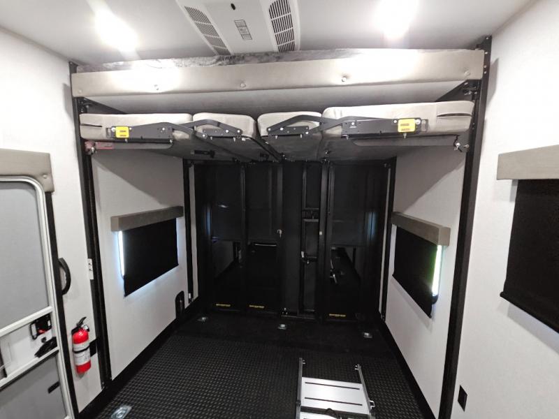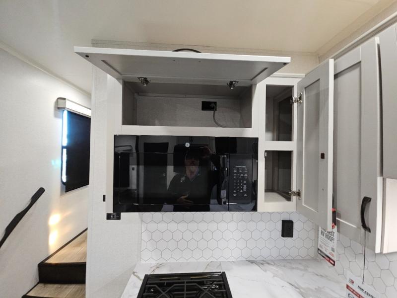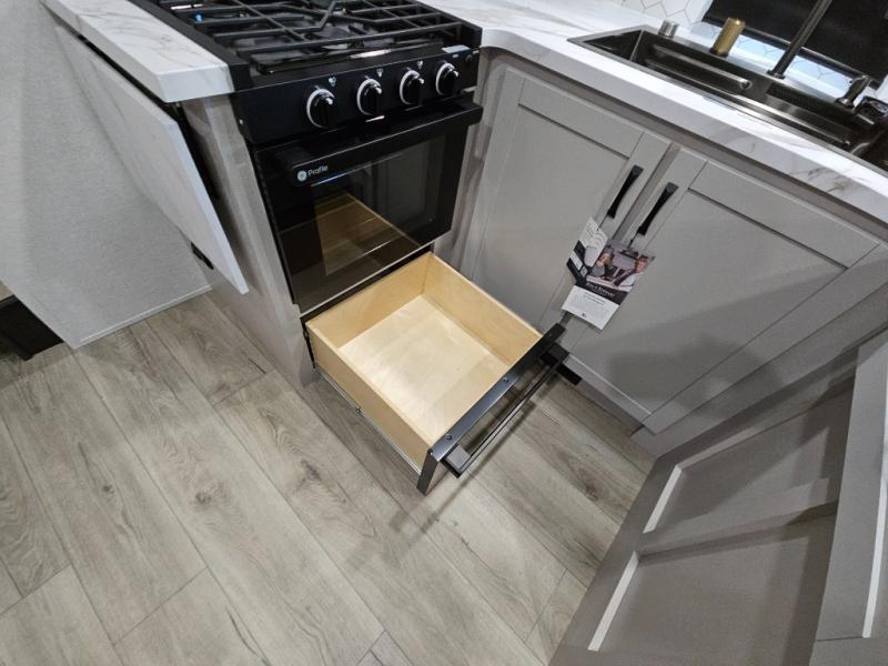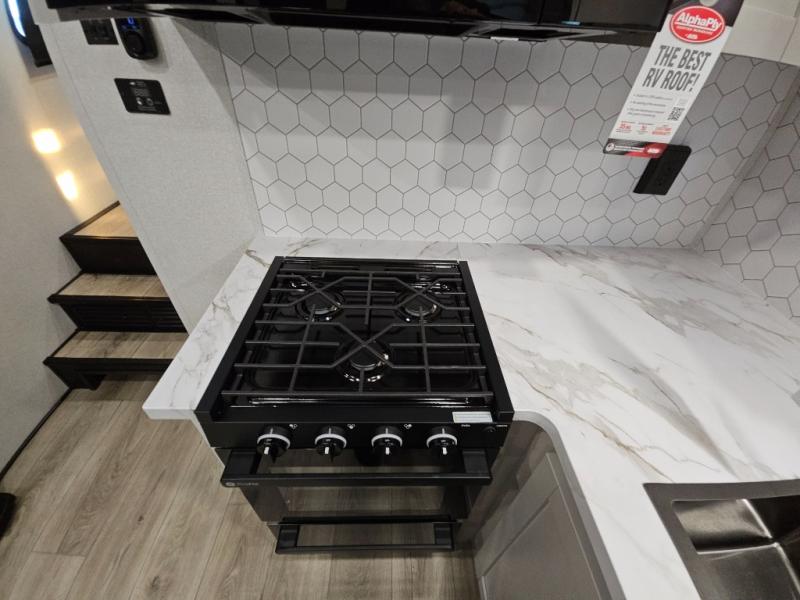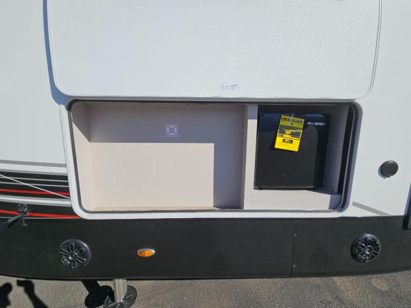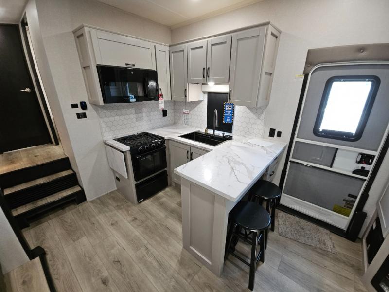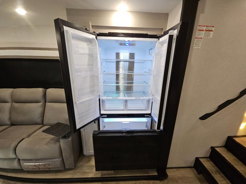 Get ready for outdoor adventures in this spacious toy hauler. Your guests will have the 11' separate garage area with its own half bath, a queen bed with rear convertible sofas, plus an overhead storage area for their things. The main living area includes a large slide out for added space, and here you can relax on the sofa that sits across from the entertainment center and fireplace. The chef will love the U-shaped kitchen counter, 17 cu. ft. 12V refrigerator, and residential oven with a three burner cooktop. You will feel right at home in the front private bedroom with its slide out wardrobe and king bed for all-around comfort.