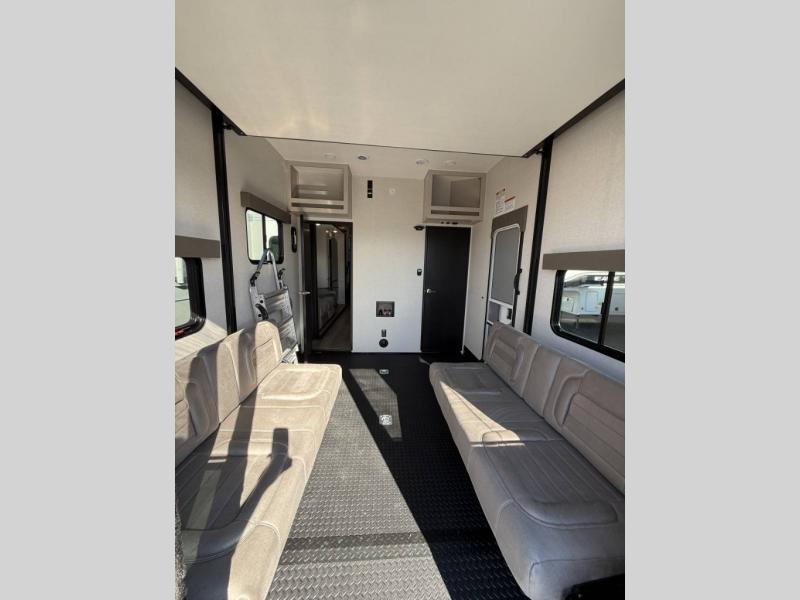 Get ready for outdoor adventures in this spacious toy hauler. Your guests will have the 11' separate garage area with its own half bath, a queen bed with rear convertible sofas, plus an overhead storage area for their things. The main living area includes a large slide out for added space, and here you can relax on the sofa that sits across from the entertainment center and fireplace. The chef will love the U-shaped kitchen counter, 17 cu. ft. 12V refrigerator, and residential oven with a three burner cooktop. You will feel right at home in the front private bedroom with its slide out wardrobe and king bed for all-around comfort.