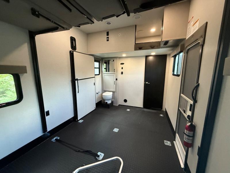 Take your outdoor adventures up a notch with this Seismic toy hauler. You can take the whole gang along for some fun with triple slides and dual entry for easy access going in and out. Your friends will sleep comfortably on the convertible sofas with overhead queen bed above in the 14' cargo garage space. There is also a storage space/loft above for their things and additional sleeping if needed. Inside, a full bath can be shared by all to get cleaned up each day, and all can gather inside in the spacious living area featuring dual opposing slides. Theater seating and an L-shaped tri-fold sofa create plenty of space for lounging. There is also a dining table for four inside and the second table in the garage area allows for more seating during meals inside when the weather isn't that nice. Two side awnings provide protection from the elements, along with a rear awning, and the rear ramp party deck with steps create even more outdoor living space to enjoy!