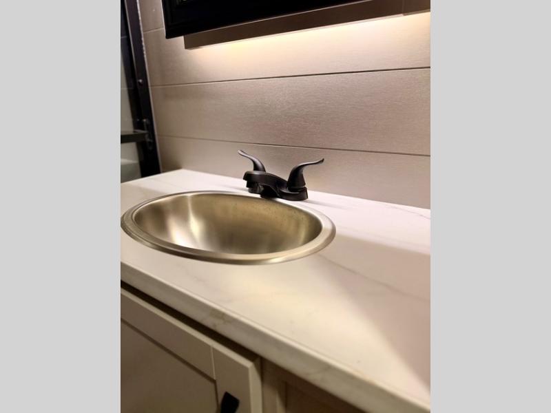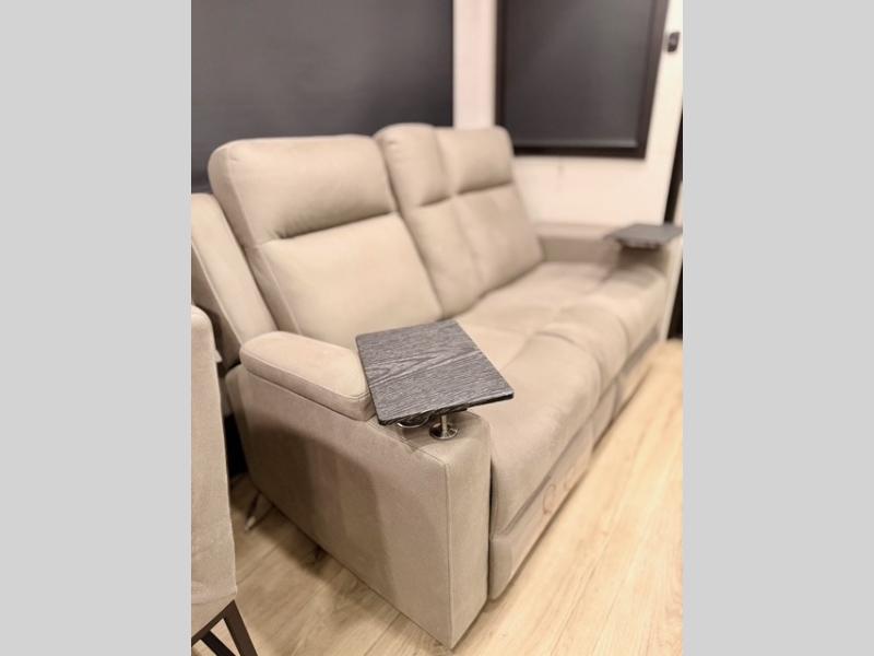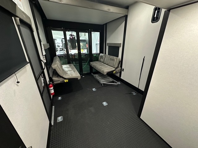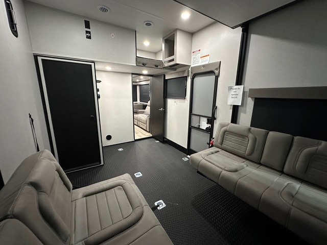 Take your outdoor adventures up a notch with this Seismic toy hauler. You can take the whole gang along for some fun with triple slides and dual entry for easy access going in and out. Your friends will sleep comfortably on the convertible sofas with overhead queen bed above in the 14' cargo garage space. There is also a storage space/loft above for their things and additional sleeping if needed. Inside, a full bath can be shared by all to get cleaned up each day, and all can gather inside in the spacious living area featuring dual opposing slides. Theater seating and an L-shaped tri-fold sofa create plenty of space for lounging. There is also a dining table for four inside and the second table in the garage area allows for more seating during meals inside when the weather isn't that nice. Two side awnings provide protection from the elements, along with a rear awning, and the rear ramp party deck with steps create even more outdoor living space to enjoy!