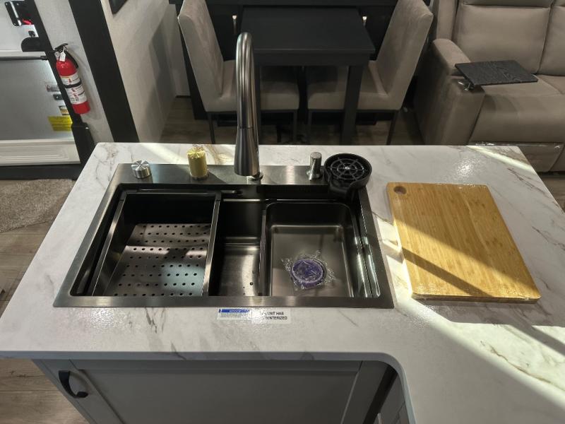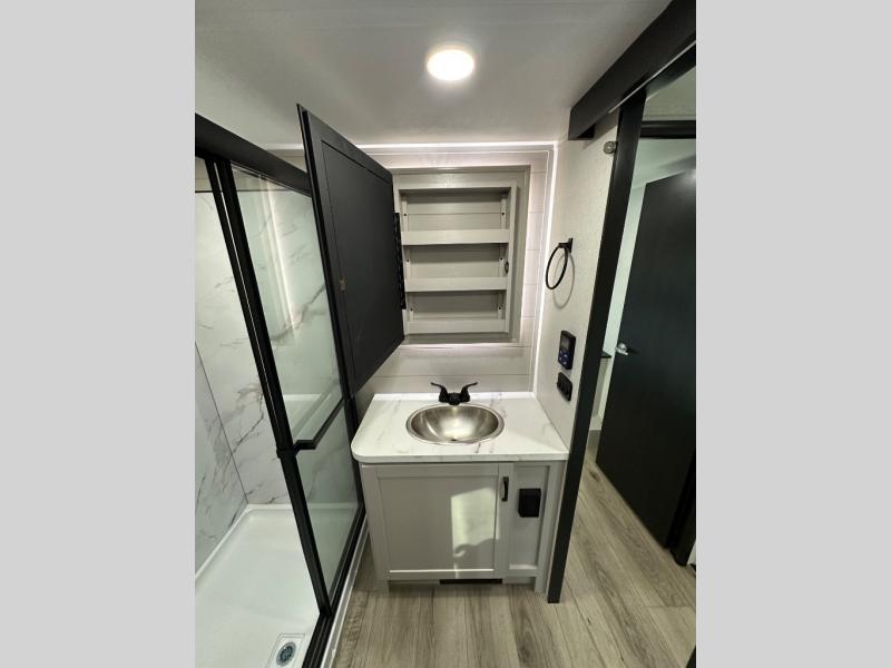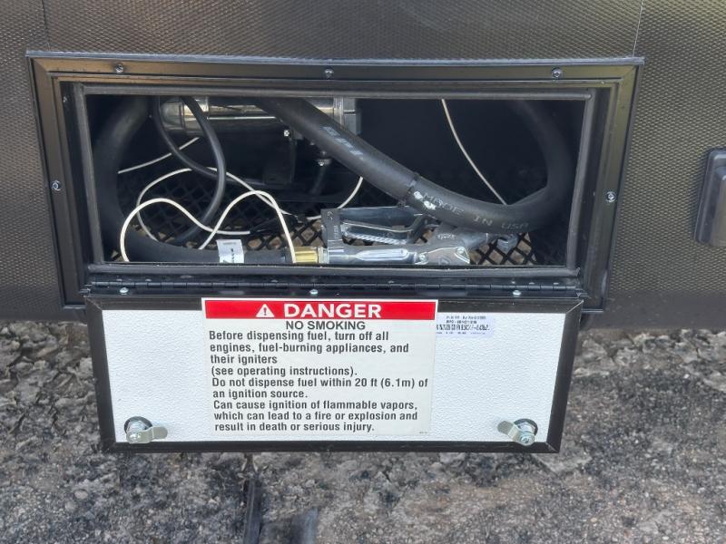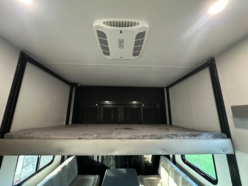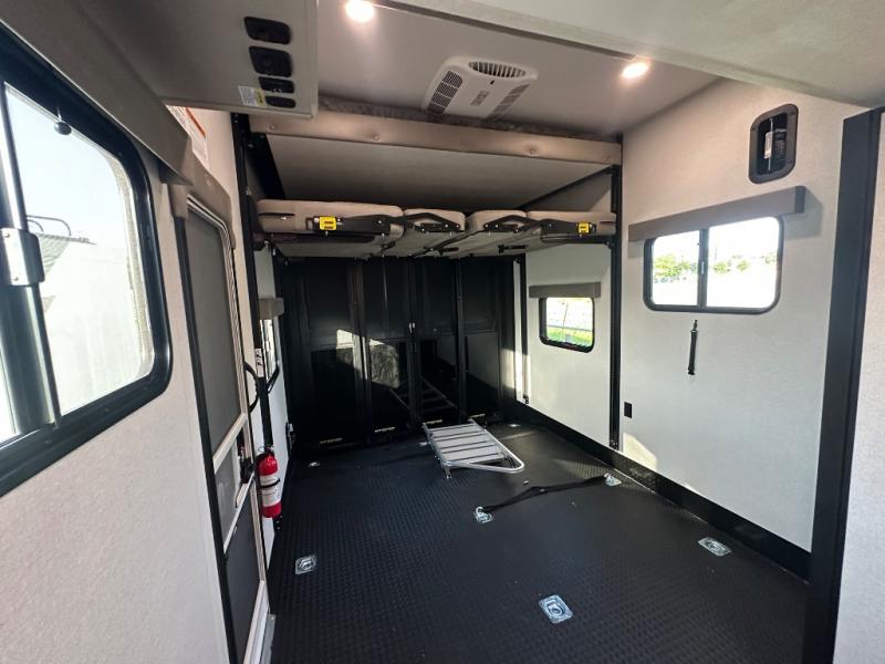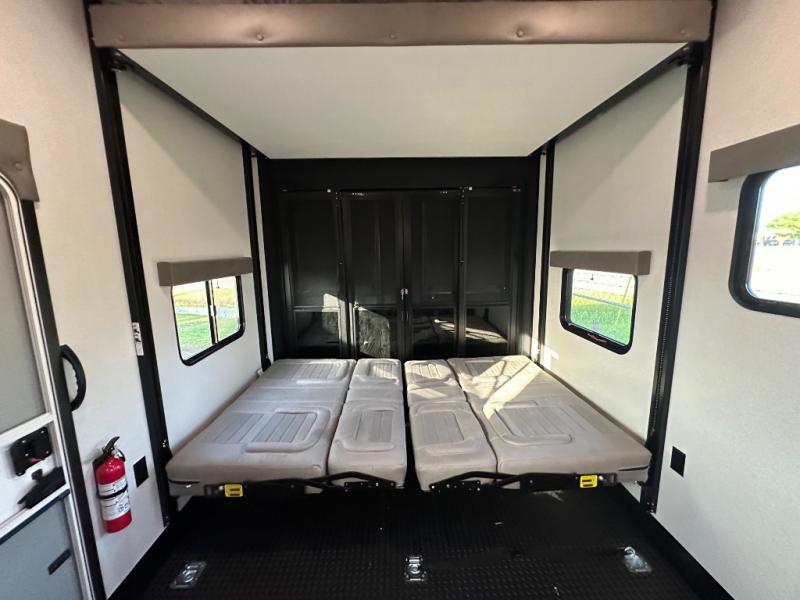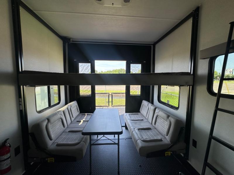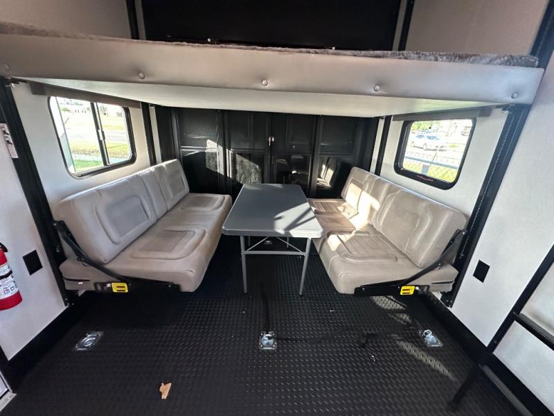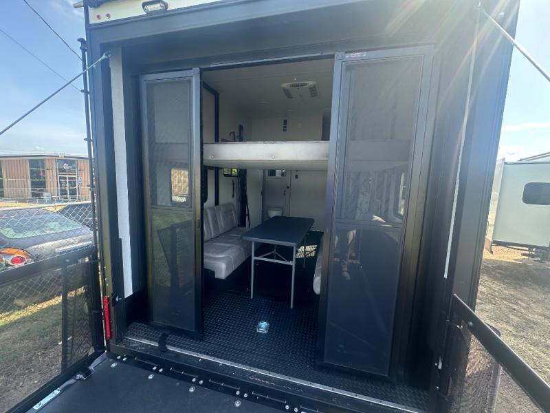 Take your outdoor adventures up a notch with this Seismic toy hauler. You can take the whole gang along for some fun with triple slides and dual entry for easy access going in and out. Your friends will sleep comfortably on the convertible sofas with overhead queen bed above in the 14' cargo garage space. There is also a storage space/loft above for their things and additional sleeping if needed. Inside, a full bath can be shared by all to get cleaned up each day, and all can gather inside in the spacious living area featuring dual opposing slides. Theater seating and an L-shaped tri-fold sofa create plenty of space for lounging. There is also a dining table for four inside and the second table in the garage area allows for more seating during meals inside when the weather isn't that nice. Two side awnings provide protection from the elements, along with a rear awning, and the rear ramp party deck with steps create even more outdoor living space to enjoy!