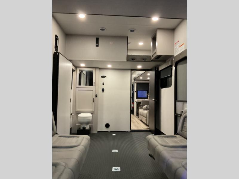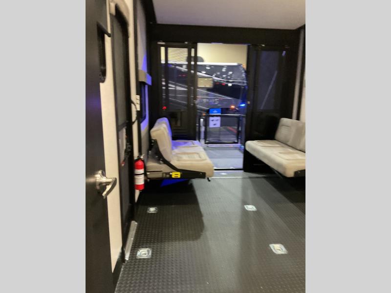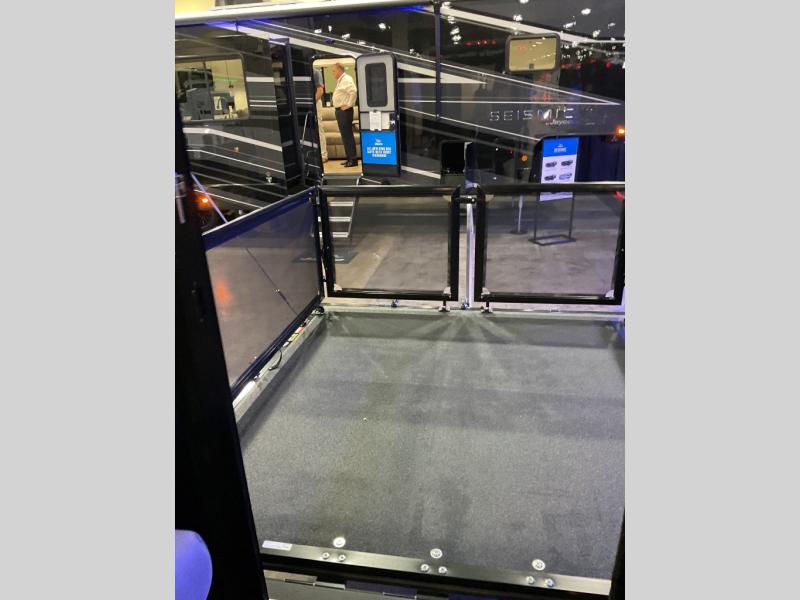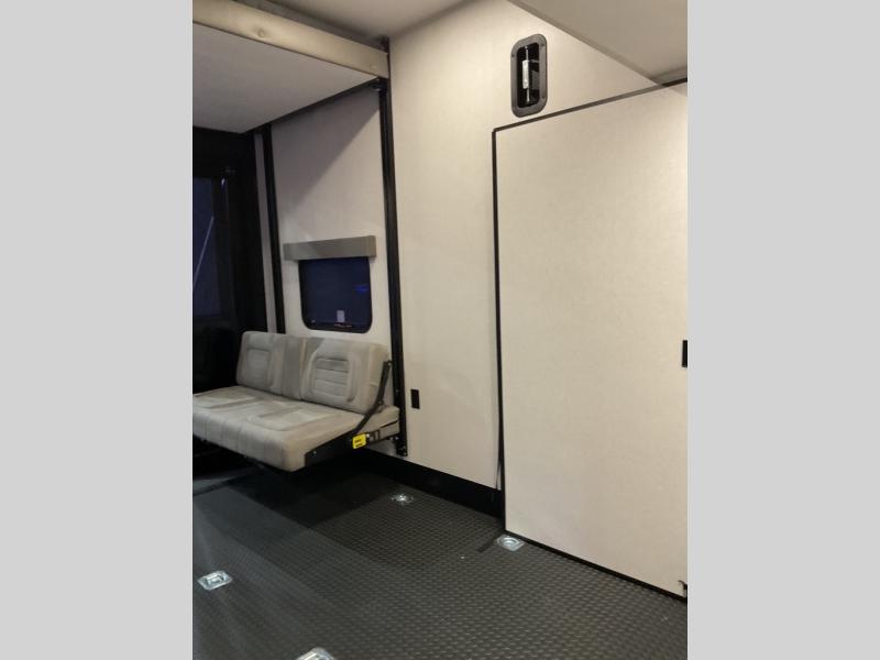 Take your outdoor adventures up a notch with this Seismic toy hauler. You can take the whole gang along for some fun with triple slides and dual entry for easy access going in and out. Your friends will sleep comfortably on the convertible sofas with overhead queen bed above in the 14' cargo garage space. There is also a storage space/loft above for their things and additional sleeping if needed. Inside, a full bath can be shared by all to get cleaned up each day, and all can gather inside in the spacious living area featuring dual opposing slides. Theater seating and an L-shaped tri-fold sofa create plenty of space for lounging. There is also a dining table for four inside and the second table in the garage area allows for more seating during meals inside when the weather isn't that nice. Two side awnings provide protection from the elements, along with a rear awning, and the rear ramp party deck with steps create even more outdoor living space to enjoy!