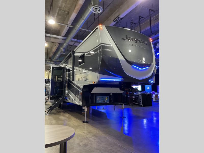 One look at the Seismic toy haulers by Jayco, and you'll never go back! Each model features a custom automotive-grade vinyl exterior graphics package, a painted fiberglass front cap with built-in LED lighting, and 102" wide-body structural steel I-beam construction. You'll find the pass-through storage with Slam-Latch baggage doors will make unpacking easier than ever, and the rear ramp door/patio with anti-slip, non-skid flooring will allow you to unload your toys with no trouble at all. These toy haulers feature a three seasons garage wall/doors, a 30 gallon fuel tank with a timer, and exterior marine-grade speakers to keep the party going. The Climate Shield zero degree tested weather protection includes a 35,000 BTU furnace, PEX plumbing, and a fully enclosed and heated underbelly so you can enjoy your adventures year around. And we haven't even touched on the interior luxuries you'll find, like solid hardwood cabinet doors, residential vinyl flooring made in the USA, night shades, and more!