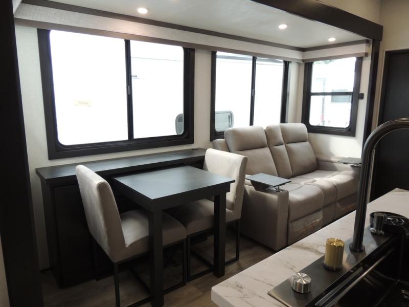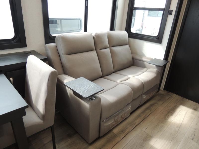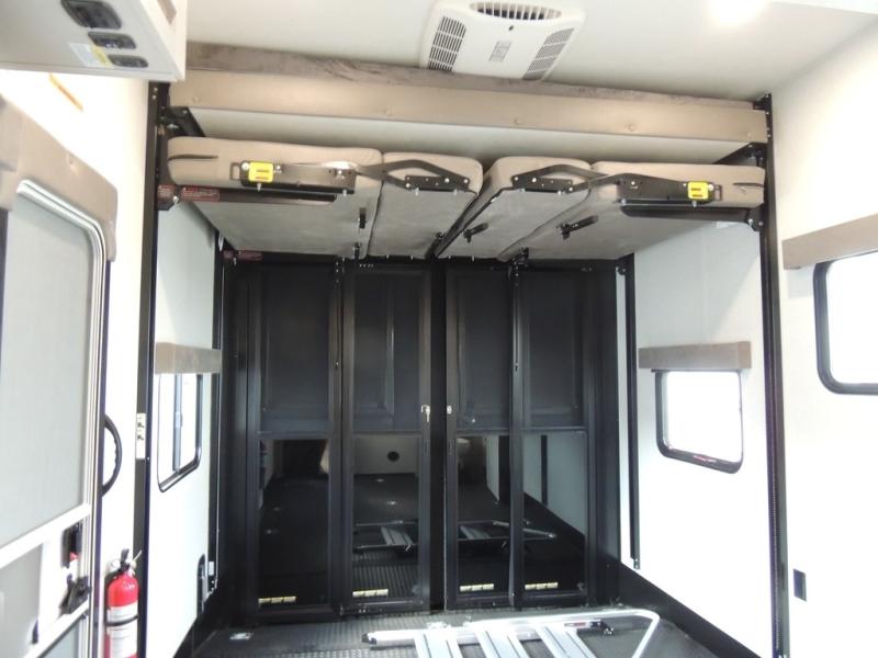Take your outdoor adventures up a notch with this Seismic toy hauler. You can take the whole gang along for some fun with triple slides and dual entry for easy access going in and out. Your friends will sleep comfortably on the convertible sofas with overhead queen bed above in the 14' cargo garage space. There is also a storage space/loft above for their things and additional sleeping if needed. Inside, a full bath can be shared by all to get cleaned up each day, and all can gather inside in the spacious living area featuring dual opposing slides. Theater seating and an L-shaped tri-fold sofa create plenty of space for lounging. There is also a dining table for four inside and the second table in the garage area allows for more seating during meals inside when the weather isn't that nice. Two side awnings provide protection from the elements, along with a rear awning, and the rear ramp party deck with steps create even more outdoor living space to enjoy!