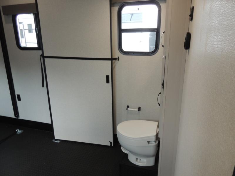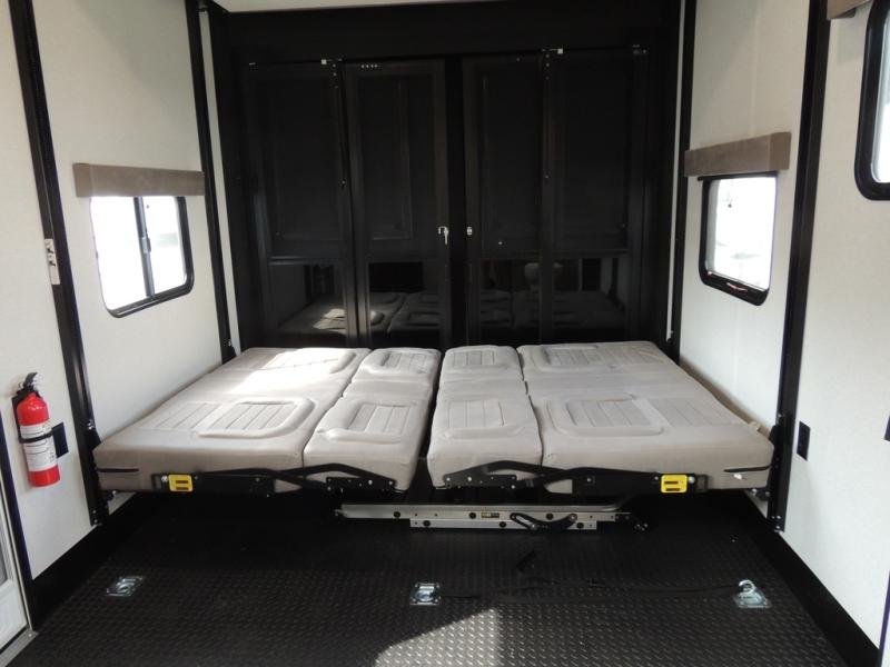 Take your outdoor adventures up a notch with this Seismic toy hauler. You can take the whole gang along for some fun with triple slides and dual entry for easy access going in and out. Your friends will sleep comfortably on the convertible sofas with overhead queen bed above in the 14' cargo garage space. There is also a storage space/loft above for their things and additional sleeping if needed. Inside, a full bath can be shared by all to get cleaned up each day, and all can gather inside in the spacious living area featuring dual opposing slides. Theater seating and an L-shaped tri-fold sofa create plenty of space for lounging. There is also a dining table for four inside and the second table in the garage area allows for more seating during meals inside when the weather isn't that nice. Two side awnings provide protection from the elements, along with a rear awning, and the rear ramp party deck with steps create even more outdoor living space to enjoy!