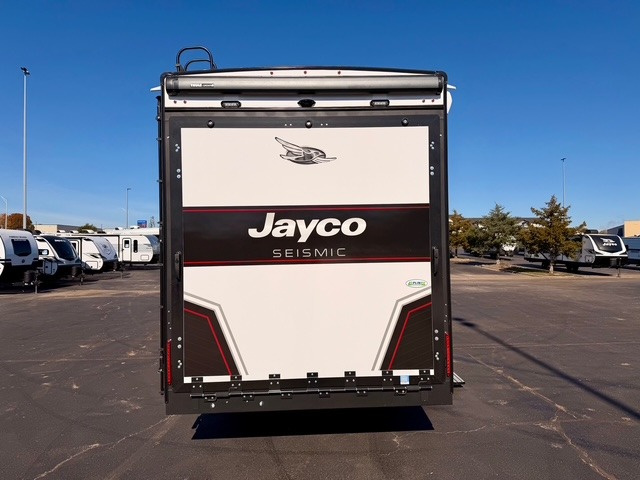 One look at the Seismic toy haulers by Jayco, and you'll never go back! Each model features a custom automotive-grade vinyl exterior graphics package, a painted fiberglass front cap with built-in LED lighting, and 102" wide-body structural steel I-beam construction. You'll find the pass-through storage with Slam-Latch baggage doors will make unpacking easier than ever, and the rear ramp door/patio with anti-slip, non-skid flooring will allow you to unload your toys with no trouble at all. These toy haulers feature a three seasons garage wall/doors, a 30 gallon fuel tank with a timer, and exterior marine-grade speakers to keep the party going. The Climate Shield zero degree tested weather protection includes a 35,000 BTU furnace, PEX plumbing, and a fully enclosed and heated underbelly so you can enjoy your adventures year around. And we haven't even touched on the interior luxuries you'll find, like solid hardwood cabinet doors, residential vinyl flooring made in the USA, night shades, and more!