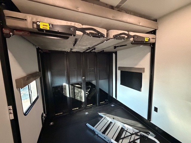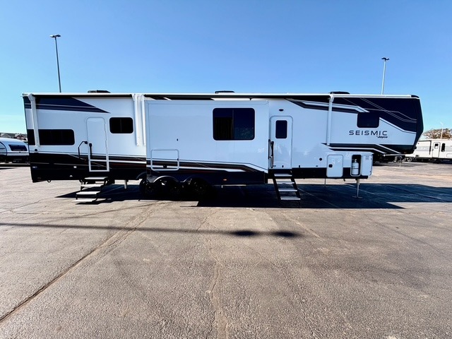 Take your outdoor adventures up a notch with this Seismic toy hauler. You can take the whole gang along for some fun with triple slides and dual entry for easy access going in and out. Your friends will sleep comfortably on the convertible sofas with overhead queen bed above in the 14' cargo garage space. There is also a storage space/loft above for their things and additional sleeping if needed. Inside, a full bath can be shared by all to get cleaned up each day, and all can gather inside in the spacious living area featuring dual opposing slides. Theater seating and an L-shaped tri-fold sofa create plenty of space for lounging. There is also a dining table for four inside and the second table in the garage area allows for more seating during meals inside when the weather isn't that nice. Two side awnings provide protection from the elements, along with a rear awning, and the rear ramp party deck with steps create even more outdoor living space to enjoy!