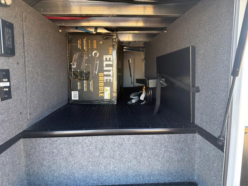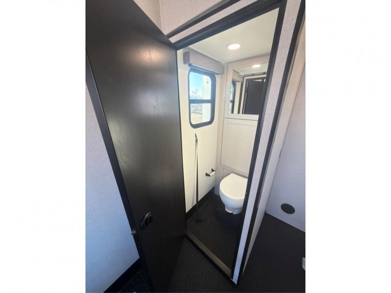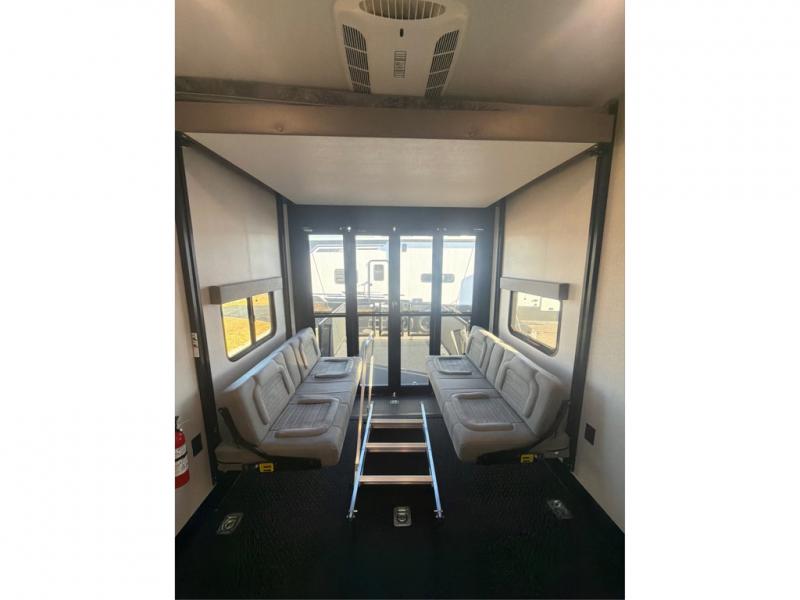 Take your outdoor adventures up a notch with this Seismic toy hauler. You can take the whole gang along for some fun with triple slides and dual entry for easy access going in and out. Your friends will sleep comfortably on the convertible sofas with overhead queen bed above in the 14' cargo garage space. There is also a storage space/loft above for their things and additional sleeping if needed. Inside, a full bath can be shared by all to get cleaned up each day, and all can gather inside in the spacious living area featuring dual opposing slides. Theater seating and an L-shaped tri-fold sofa create plenty of space for lounging. There is also a dining table for four inside and the second table in the garage area allows for more seating during meals inside when the weather isn't that nice. Two side awnings provide protection from the elements, along with a rear awning, and the rear ramp party deck with steps create even more outdoor living space to enjoy!