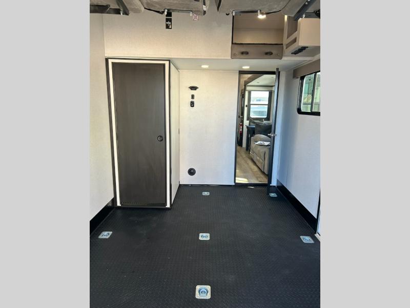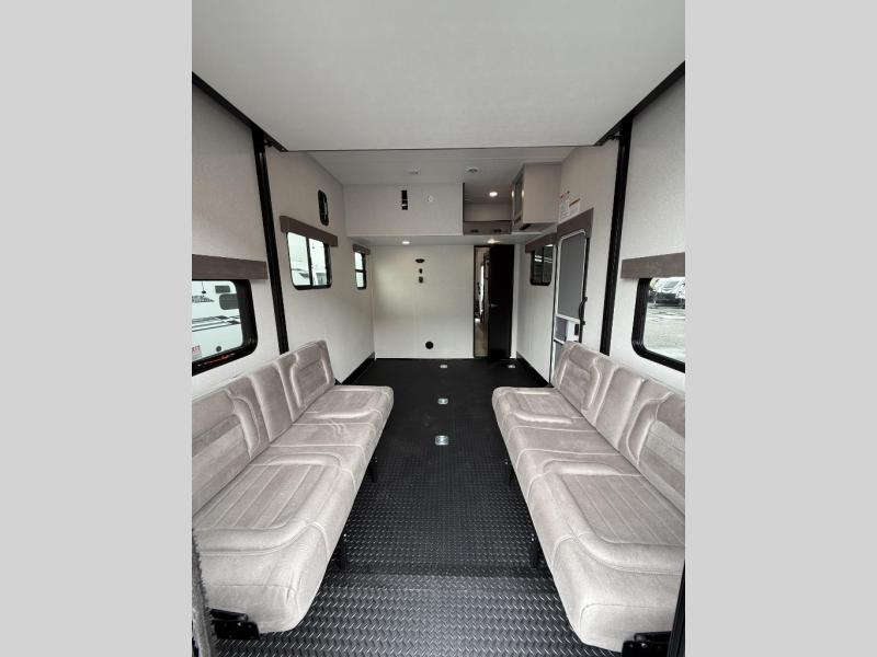 One look at the Seismic toy haulers by Jayco, and you'll never go back! Each model features a custom automotive-grade vinyl exterior graphics package, a painted fiberglass front cap with built-in LED lighting, and 102" wide-body structural steel I-beam construction. You'll find the pass-through storage with Slam-Latch baggage doors will make unpacking easier than ever, and the rear ramp door/patio with anti-slip, non-skid flooring will allow you to unload your toys with no trouble at all. These toy haulers feature a three seasons garage wall/doors, a 30 gallon fuel tank with a timer, and exterior marine-grade speakers to keep the party going. The Climate Shield zero degree tested weather protection includes a 35,000 BTU furnace, PEX plumbing, and a fully enclosed and heated underbelly so you can enjoy your adventures year around. And we haven't even touched on the interior luxuries you'll find, like solid hardwood cabinet doors, residential vinyl flooring made in the USA, night shades, and more!