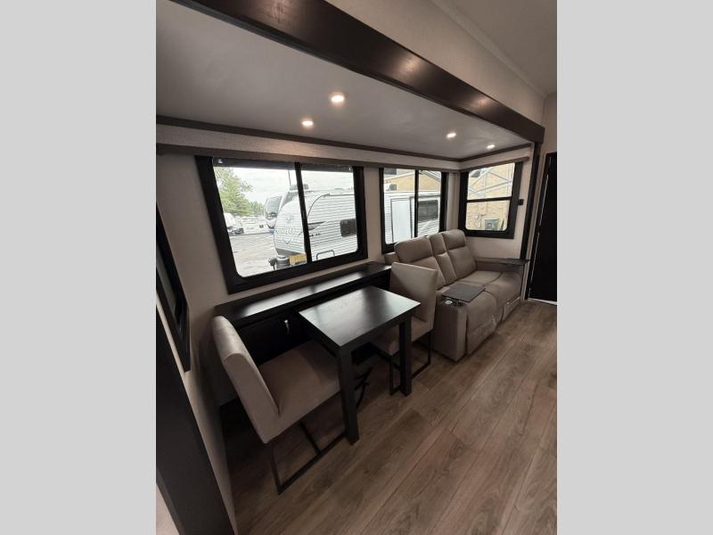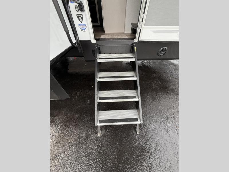 Take your outdoor adventures up a notch with this Seismic toy hauler. You can take the whole gang along for some fun with triple slides and dual entry for easy access going in and out. Your friends will sleep comfortably on the convertible sofas with overhead queen bed above in the 14' cargo garage space. There is also a storage space/loft above for their things and additional sleeping if needed. Inside, a full bath can be shared by all to get cleaned up each day, and all can gather inside in the spacious living area featuring dual opposing slides. Theater seating and an L-shaped tri-fold sofa create plenty of space for lounging. There is also a dining table for four inside and the second table in the garage area allows for more seating during meals inside when the weather isn't that nice. Two side awnings provide protection from the elements, along with a rear awning, and the rear ramp party deck with steps create even more outdoor living space to enjoy!