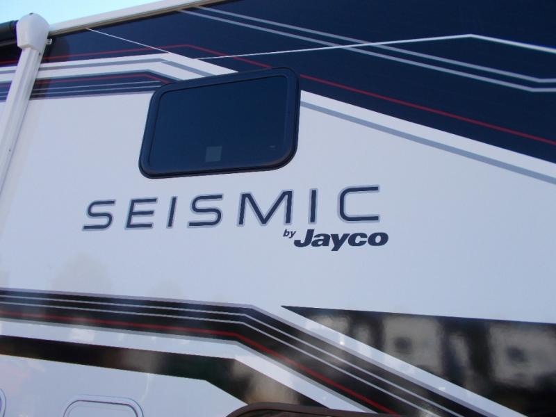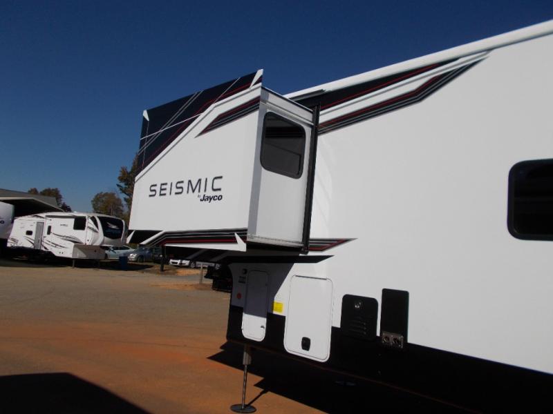 One look at the Seismic toy haulers by Jayco, and you'll never go back! Each model features a custom automotive-grade vinyl exterior graphics package, a painted fiberglass front cap with built-in LED lighting, and 102" wide-body structural steel I-beam construction. You'll find the pass-through storage with Slam-Latch baggage doors will make unpacking easier than ever, and the rear ramp door/patio with anti-slip, non-skid flooring will allow you to unload your toys with no trouble at all. These toy haulers feature a three seasons garage wall/doors, a 30 gallon fuel tank with a timer, and exterior marine-grade speakers to keep the party going. The Climate Shield zero degree tested weather protection includes a 35,000 BTU furnace, PEX plumbing, and a fully enclosed and heated underbelly so you can enjoy your adventures year around. And we haven't even touched on the interior luxuries you'll find, like solid hardwood cabinet doors, residential vinyl flooring made in the USA, night shades, and more!