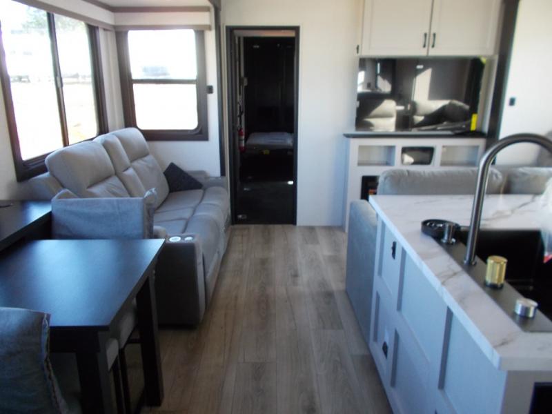 Take your outdoor adventures up a notch with this Seismic toy hauler. You can take the whole gang along for some fun with triple slides and dual entry for easy access going in and out. Your friends will sleep comfortably on the convertible sofas with overhead queen bed above in the 14' cargo garage space. There is also a storage space/loft above for their things and additional sleeping if needed. Inside, a full bath can be shared by all to get cleaned up each day, and all can gather inside in the spacious living area featuring dual opposing slides. Theater seating and an L-shaped tri-fold sofa create plenty of space for lounging. There is also a dining table for four inside and the second table in the garage area allows for more seating during meals inside when the weather isn't that nice. Two side awnings provide protection from the elements, along with a rear awning, and the rear ramp party deck with steps create even more outdoor living space to enjoy!