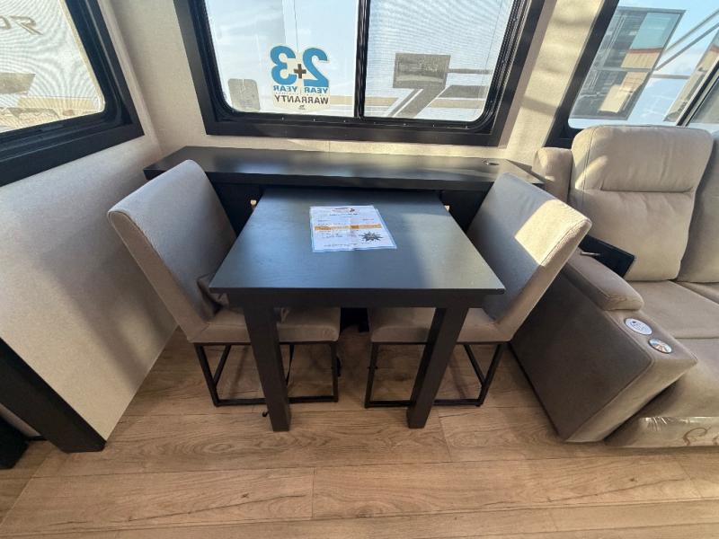 Take your outdoor adventures up a notch with this Seismic toy hauler. You can take the whole gang along for some fun with triple slides and dual entry for easy access going in and out. Your friends will sleep comfortably on the convertible sofas with overhead queen bed above in the 14' cargo garage space. There is also a storage space/loft above for their things and additional sleeping if needed. Inside, a full bath can be shared by all to get cleaned up each day, and all can gather inside in the spacious living area featuring dual opposing slides. Theater seating and an L-shaped tri-fold sofa create plenty of space for lounging. There is also a dining table for four inside and the second table in the garage area allows for more seating during meals inside when the weather isn't that nice. Two side awnings provide protection from the elements, along with a rear awning, and the rear ramp party deck with steps create even more outdoor living space to enjoy!