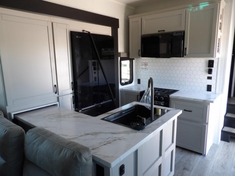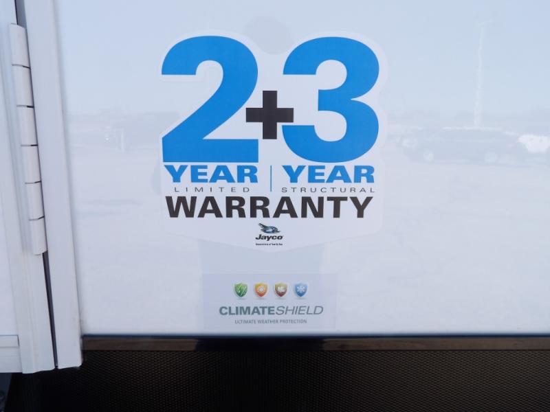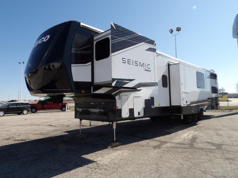 One look at the Seismic toy hauler fifth wheels by Jayco, and you'll never go back! Each model features a custom automotive-grade vinyl exterior graphics package, a painted fiberglass front cap with built-in LED lighting, and 102" wide-body structural steel I-beam construction. You'll find the pass-through storage with Slam-Latch baggage doors will make unpacking easier than ever, and the rear ramp door/patio with anti-slip, non-skid flooring will allow you to unload your toys with no trouble at all. These toy haulers feature a three-season garage wall/doors, a 30-gallon fuel tank with a timer, and exterior marine-grade speakers to keep the party going. The Climate Shield zero degree tested weather protection includes a 35,000 BTU furnace and a fully enclosed and heated underbelly for better protection against the elements. And we haven't even touched on the interior luxuries you'll find, like solid hardwood cabinet doors, residential vinyl flooring made in the USA, night roller shades, and more!
