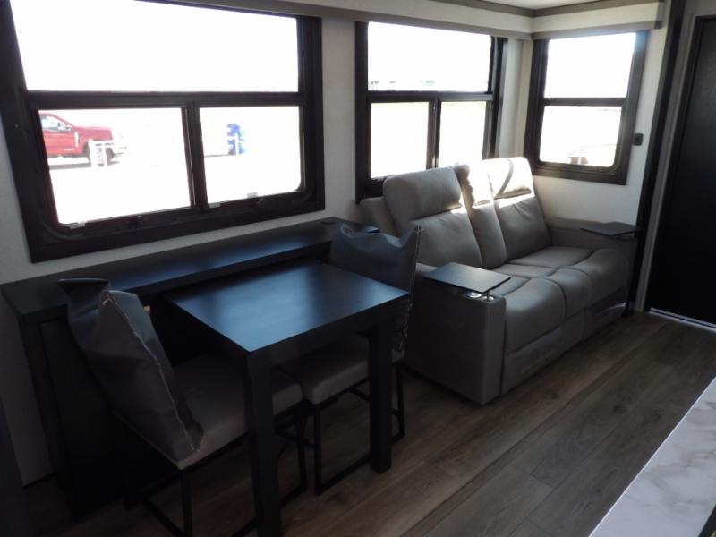 Take your outdoor adventures up a notch with this Seismic toy hauler. You can take the whole gang along for some fun with triple slides and dual entry for easy access going in and out. Your friends will sleep comfortably on the convertible sofas with overhead queen bed above in the 14' cargo garage space. There is also a storage space/loft above for their things and additional sleeping if needed. Inside, a full bath can be shared by all to get cleaned up each day, and all can gather inside in the spacious living area featuring dual opposing slides. Theater seating and an L-shaped tri-fold sofa create plenty of space for lounging. There is also a dining table for four inside and the second table in the garage area allows for more seating during meals inside when the weather isn't that nice. Two side awnings provide protection from the elements, along with a rear awning, and the rear ramp party deck with steps create even more outdoor living space to enjoy!