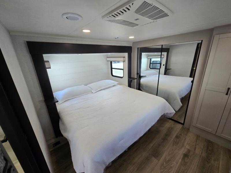 Positioned in a third slide-out, the bed leaves room to walk around and expands the bedroom living space. -