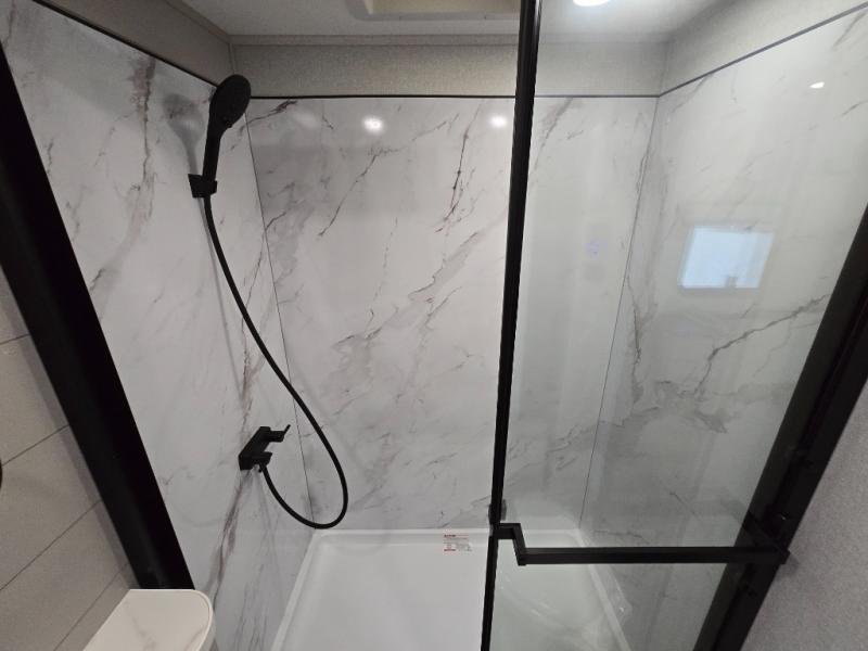 Spacious residential-style shower with glass doors—adds to the home-like feel of the bathroom. -