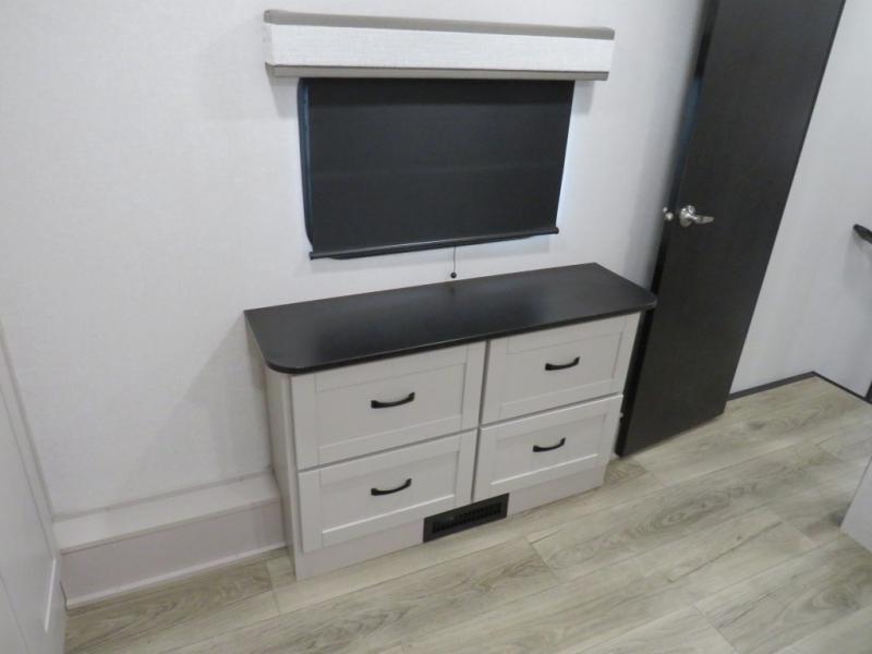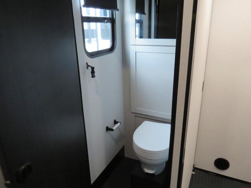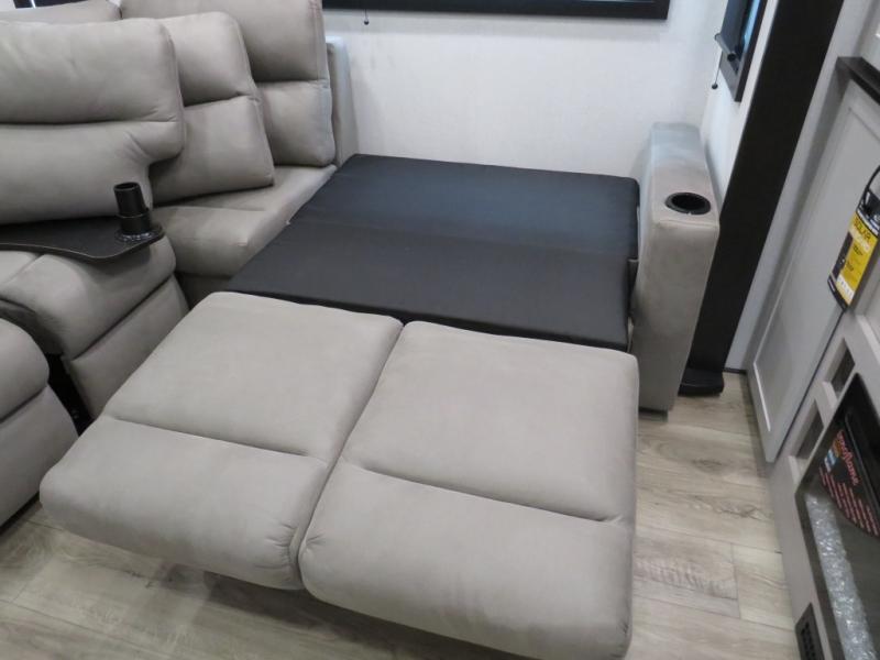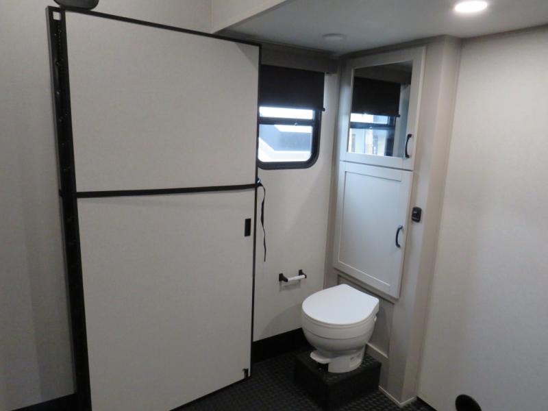 Get ready for outdoor adventures in this spacious toy hauler. Your guests will have the 13' 6" garage with queen bed with convertible sofa and a loft for added sleeping space, plus there is overhead storage for your things and a side man door to come and go easily. The main living area includes dual opposing slides with an L-shaped tri-fold sofa along the roadside and your dinette and refrigerator plus pantry in the curbside slide. Head up the steps to your front private bedroom with the dual entry bath accessible from the hall and inside the master bedroom. Here you will all enjoy a walk-in shower, toilet, and vanity with a sink, plus overhead storage. The bedroom features a third slide out housing a queen bed for added floor space, plus a full front walk-in closet, a dresser, and washer/dryer prep!