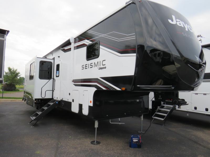 One look at the Seismic toy haulers by Jayco, and you'll never go back! Each model features a custom automotive-grade vinyl exterior graphics package, a painted fiberglass front cap with built-in LED lighting, and 102" wide-body structural steel I-beam construction. You'll find the pass-through storage with Slam-Latch baggage doors will make unpacking easier than ever, and the rear ramp door/patio with anti-slip, non-skid flooring will allow you to unload your toys with no trouble at all. These toy haulers feature a three seasons garage wall/doors, a 30 gallon fuel tank with a timer, and exterior marine-grade speakers to keep the party going. The Climate Shield zero degree tested weather protection includes a 35,000 BTU furnace, PEX plumbing, and a fully enclosed and heated underbelly so you can enjoy your adventures year around. And we haven't even touched on the interior luxuries you'll find, like solid hardwood cabinet doors, residential vinyl flooring made in the USA, night shades, and more!