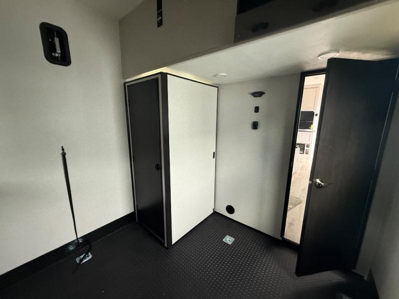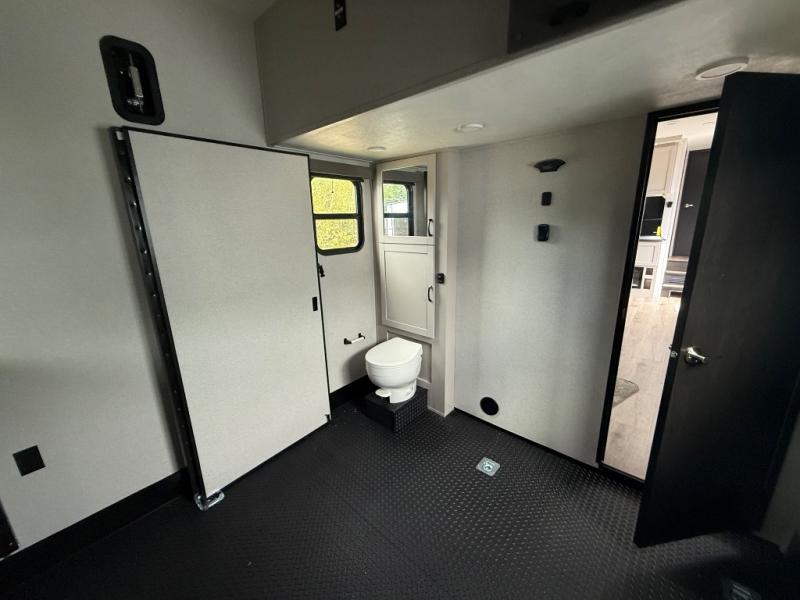Get ready for outdoor adventures in this spacious toy hauler. Your guests will have the 13' 6" garage with queen bed with convertible sofa and a loft for added sleeping space, plus there is overhead storage for your things and a side man door to come and go easily. The main living area includes dual opposing slides with an L-shaped tri-fold sofa along the roadside and your dinette and refrigerator plus pantry in the curbside slide. Head up the steps to your front private bedroom with the dual entry bath accessible from the hall and inside the master bedroom. Here you will all enjoy a walk-in shower, toilet, and vanity with a sink, plus overhead storage. The bedroom features a third slide out housing a queen bed for added floor space, plus a full front walk-in closet, a dresser, and washer/dryer prep!
