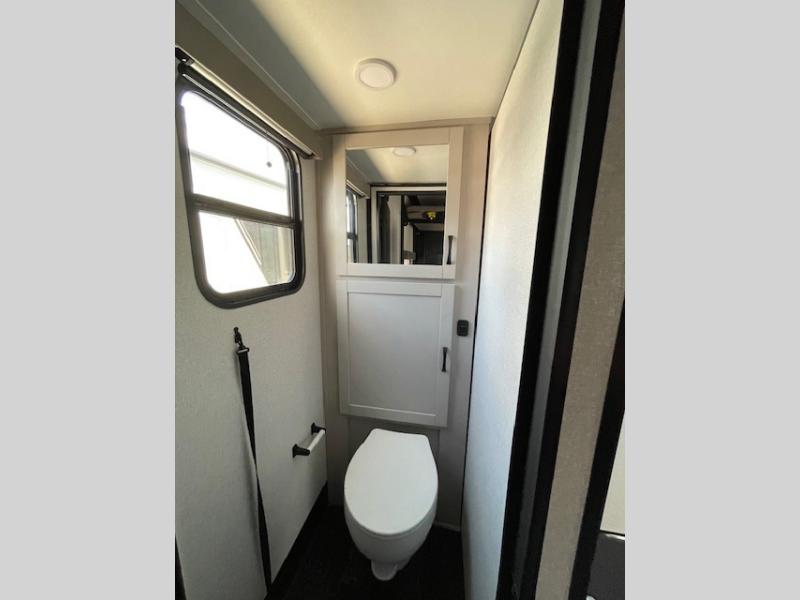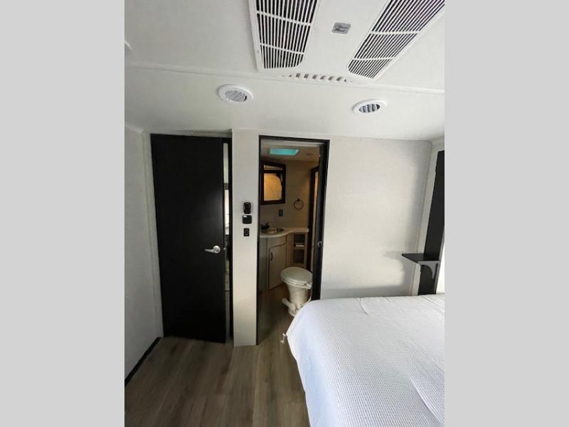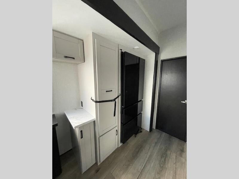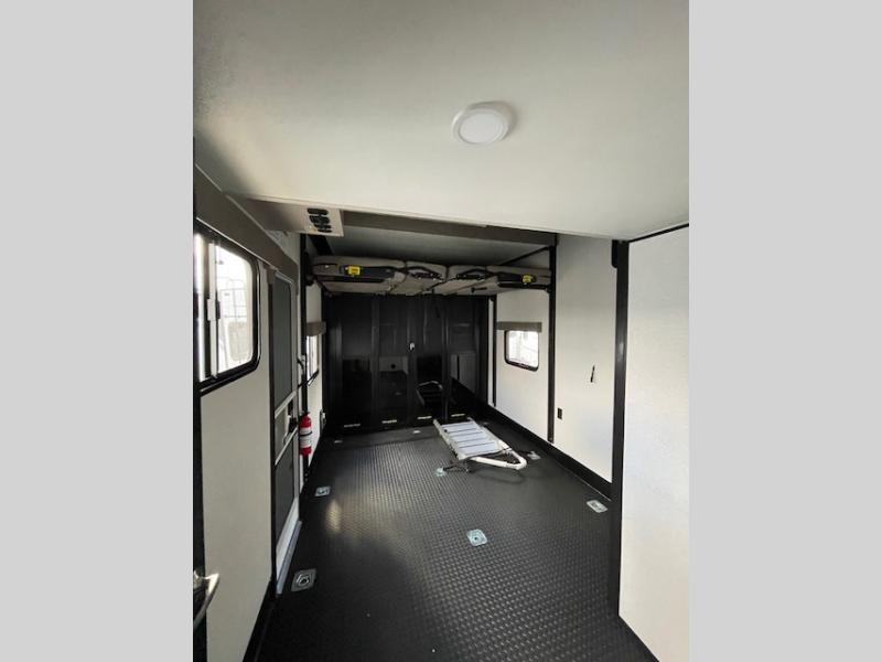 Get ready for outdoor adventures in this spacious toy hauler. Your guests will have the 13' 6" garage with queen bed with convertible sofa and a loft for added sleeping space, plus there is overhead storage for your things and a side man door to come and go easily. The main living area includes dual opposing slides with an L-shaped tri-fold sofa along the roadside and your dinette and refrigerator plus pantry in the curbside slide. Head up the steps to your front private bedroom with the dual entry bath accessible from the hall and inside the master bedroom. Here you will all enjoy a walk-in shower, toilet, and vanity with a sink, plus overhead storage. The bedroom features a third slide out housing a queen bed for added floor space, plus a full front walk-in closet, a dresser, and washer/dryer prep!