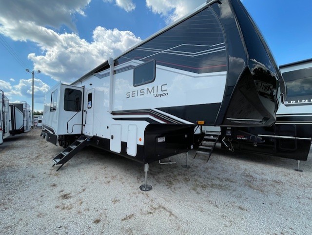 One look at the Seismic toy haulers by Jayco, and you'll never go back! Each model features a custom automotive-grade vinyl exterior graphics package, a painted fiberglass front cap with built-in LED lighting, and 102" wide-body structural steel I-beam construction. You'll find the pass-through storage with Slam-Latch baggage doors will make unpacking easier than ever, and the rear ramp door/patio with anti-slip, non-skid flooring will allow you to unload your toys with no trouble at all. These toy haulers feature a three seasons garage wall/doors, a 30 gallon fuel tank with a timer, and exterior marine-grade speakers to keep the party going. The Climate Shield zero degree tested weather protection includes a 35,000 BTU furnace, PEX plumbing, and a fully enclosed and heated underbelly so you can enjoy your adventures year around. And we haven't even touched on the interior luxuries you'll find, like solid hardwood cabinet doors, residential vinyl flooring made in the USA, night shades, and more!
