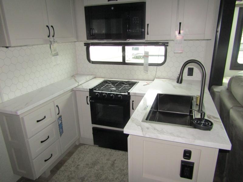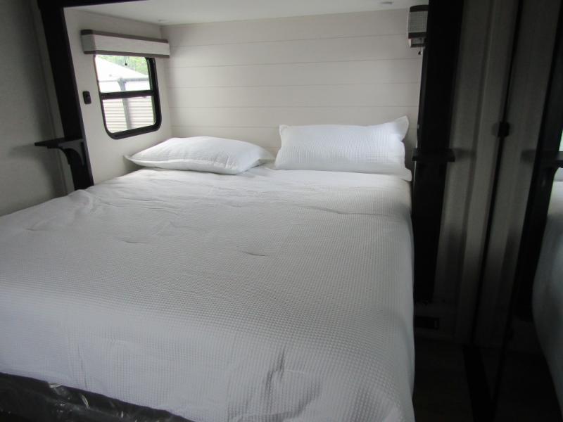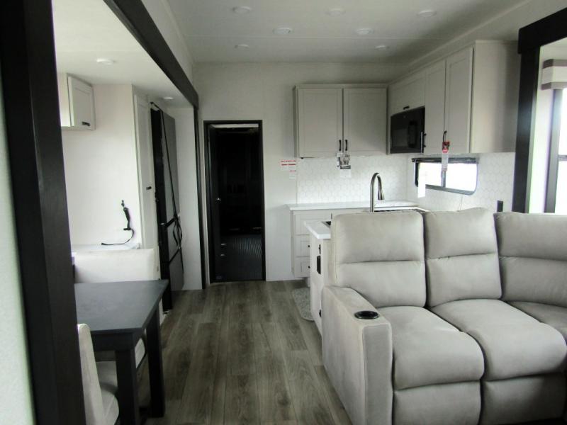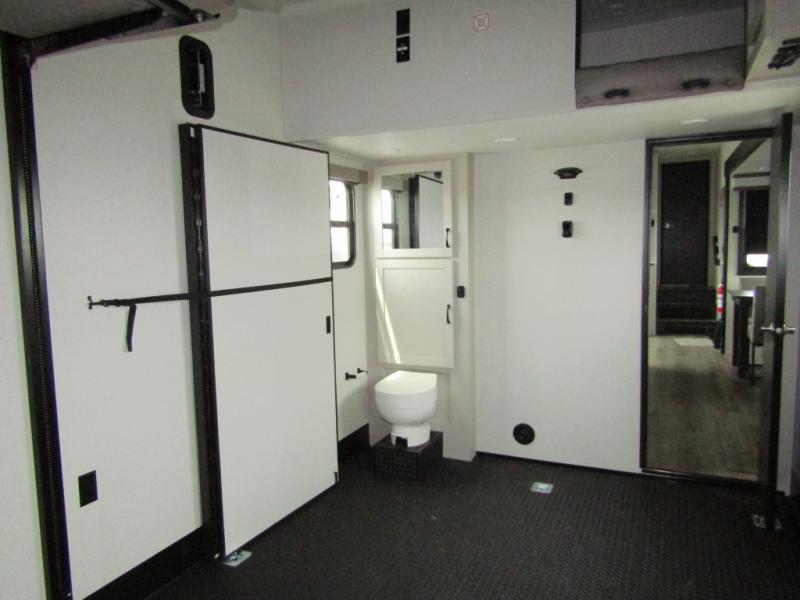 Get ready for outdoor adventures in this spacious toy hauler. Your guests will have the 13' 6" garage with queen bed with convertible sofa and a loft for added sleeping space, plus there is overhead storage for your things and a side man door to come and go easily. The main living area includes dual opposing slides with an L-shaped tri-fold sofa along the roadside and your dinette and refrigerator plus pantry in the curbside slide. Head up the steps to your front private bedroom with the dual entry bath accessible from the hall and inside the master bedroom. Here you will all enjoy a walk-in shower, toilet, and vanity with a sink, plus overhead storage. The bedroom features a third slide out housing a queen bed for added floor space, plus a full front walk-in closet, a dresser, and washer/dryer prep!