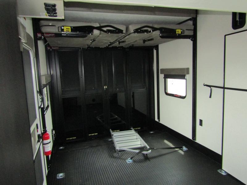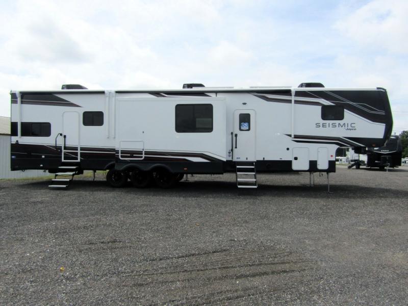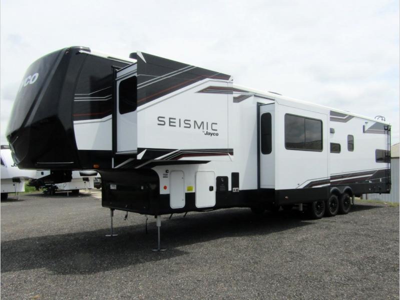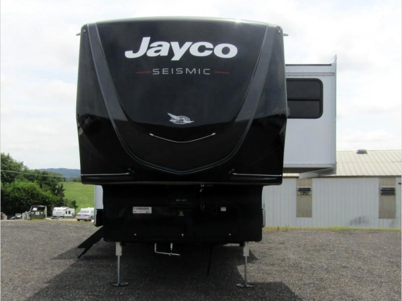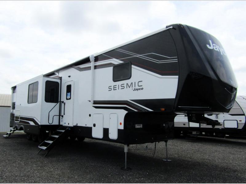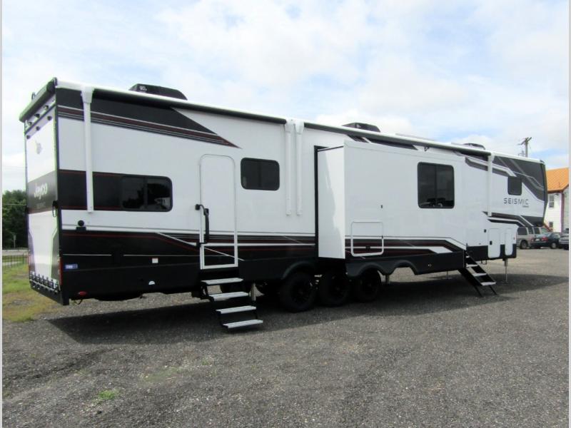 One look at the Seismic toy haulers by Jayco, and you'll never go back! Each model features a custom automotive-grade vinyl exterior graphics package, a painted fiberglass front cap with built-in LED lighting, and 102" wide-body structural steel I-beam construction. You'll find the pass-through storage with Slam-Latch baggage doors will make unpacking easier than ever, and the rear ramp door/patio with anti-slip, non-skid flooring will allow you to unload your toys with no trouble at all. These toy haulers feature a three seasons garage wall/doors, a 30 gallon fuel tank with a timer, and exterior marine-grade speakers to keep the party going. The Climate Shield zero degree tested weather protection includes a 35,000 BTU furnace, PEX plumbing, and a fully enclosed and heated underbelly so you can enjoy your adventures year around. And we haven't even touched on the interior luxuries you'll find, like solid hardwood cabinet doors, residential vinyl flooring made in the USA, night shades, and more!