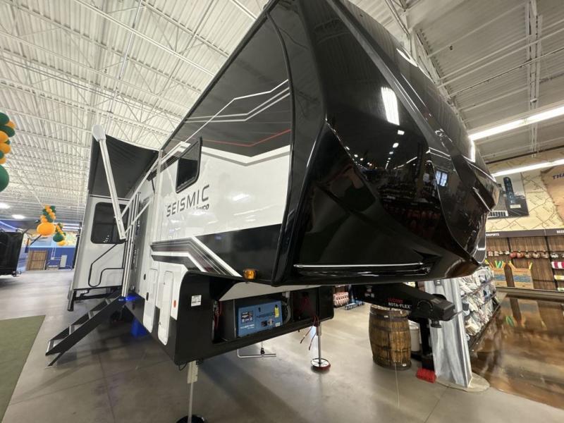 One look at the Seismic toy haulers by Jayco, and you'll never go back! Each model features a custom automotive-grade vinyl exterior graphics package, a painted fiberglass front cap with built-in LED lighting, and 102" wide-body structural steel I-beam construction. You'll find the pass-through storage with Slam-Latch baggage doors will make unpacking easier than ever, and the rear ramp door/patio with anti-slip, non-skid flooring will allow you to unload your toys with no trouble at all. These toy haulers feature a three seasons garage wall/doors, a 30 gallon fuel tank with a timer, and exterior marine-grade speakers to keep the party going. The Climate Shield zero degree tested weather protection includes a 35,000 BTU furnace, PEX plumbing, and a fully enclosed and heated underbelly so you can enjoy your adventures year around. And we haven't even touched on the interior luxuries you'll find, like solid hardwood cabinet doors, residential vinyl flooring made in the USA, night shades, and more!