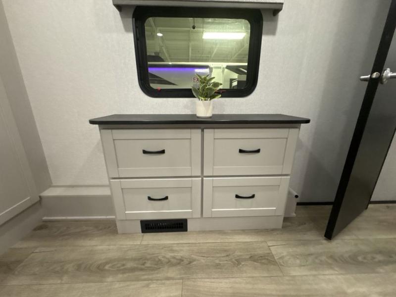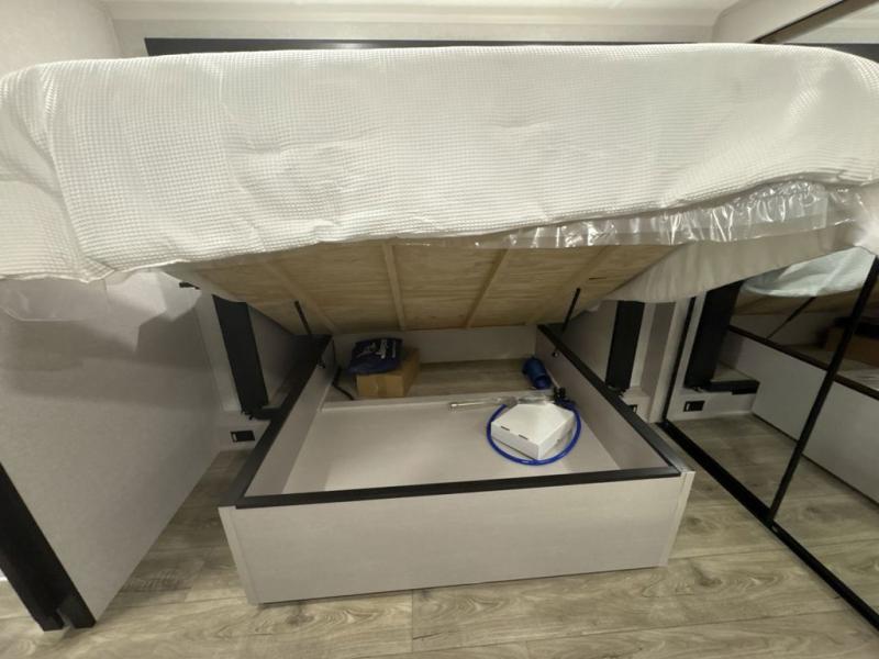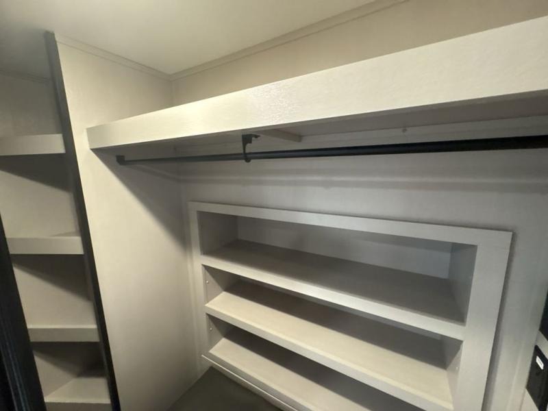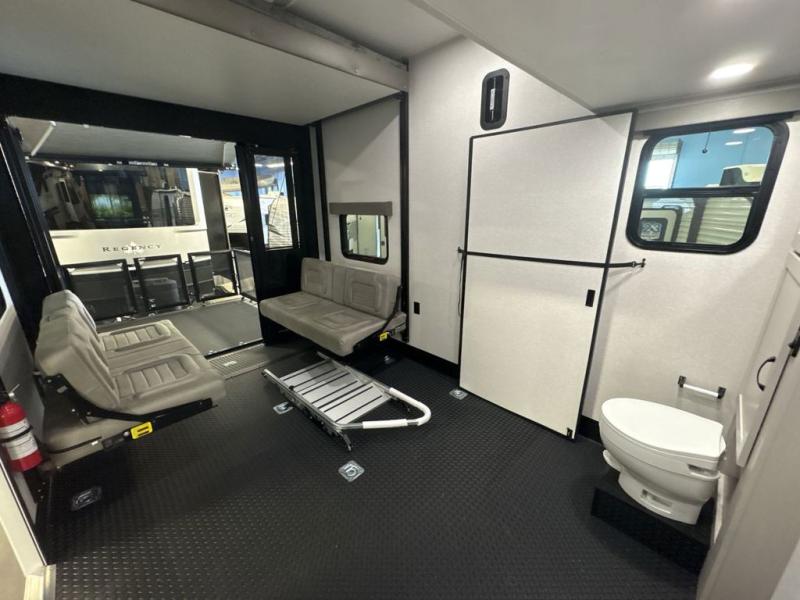 Get ready for outdoor adventures in this spacious toy hauler. Your guests will have the 13' 6" garage with queen bed with convertible sofa and a loft for added sleeping space, plus there is overhead storage for your things and a side man door to come and go easily. The main living area includes dual opposing slides with an L-shaped tri-fold sofa along the roadside and your dinette and refrigerator plus pantry in the curbside slide. Head up the steps to your front private bedroom with the dual entry bath accessible from the hall and inside the master bedroom. Here you will all enjoy a walk-in shower, toilet, and vanity with a sink, plus overhead storage. The bedroom features a third slide out housing a queen bed for added floor space, plus a full front walk-in closet, a dresser, and washer/dryer prep!