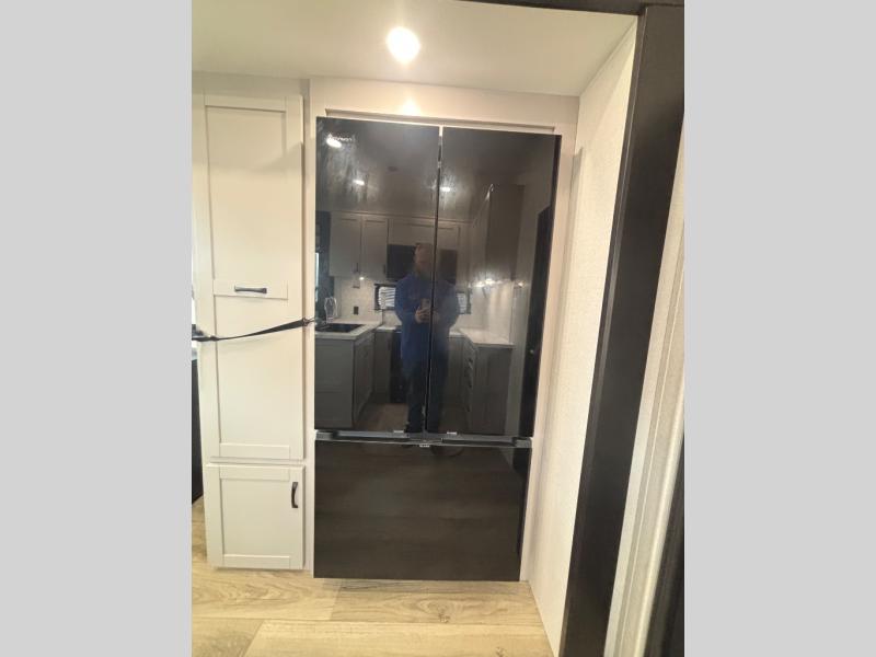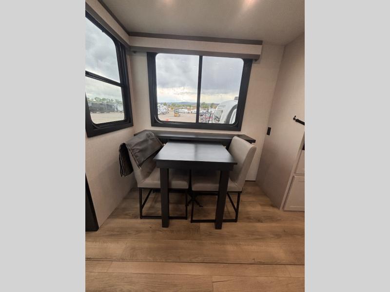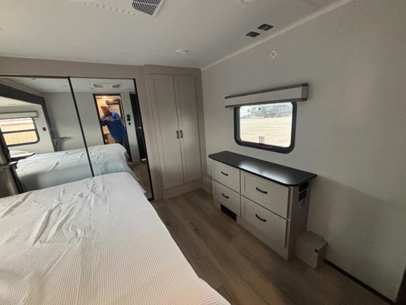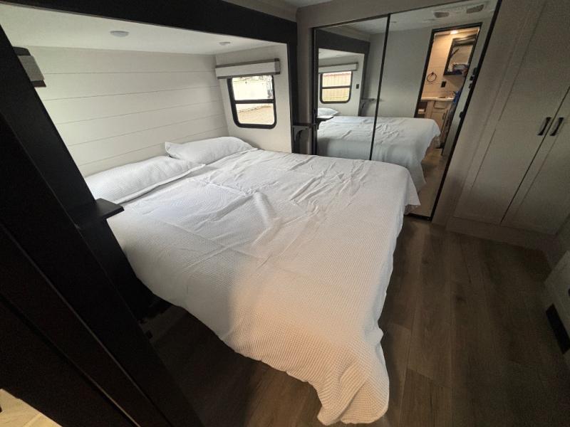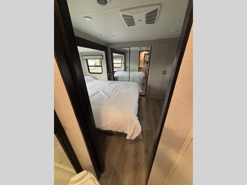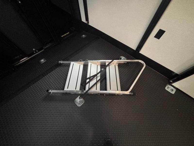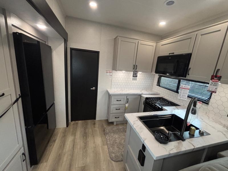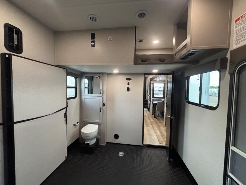 Get ready for outdoor adventures in this spacious toy hauler. Your guests will have the 13' 6" garage with queen bed with convertible sofa and a loft for added sleeping space, plus there is overhead storage for your things and a side man door to come and go easily. The main living area includes dual opposing slides with an L-shaped tri-fold sofa along the roadside and your dinette and refrigerator plus pantry in the curbside slide. Head up the steps to your front private bedroom with the dual entry bath accessible from the hall and inside the master bedroom. Here you will all enjoy a walk-in shower, toilet, and vanity with a sink, plus overhead storage. The bedroom features a third slide out housing a queen bed for added floor space, plus a full front walk-in closet, a dresser, and washer/dryer prep!