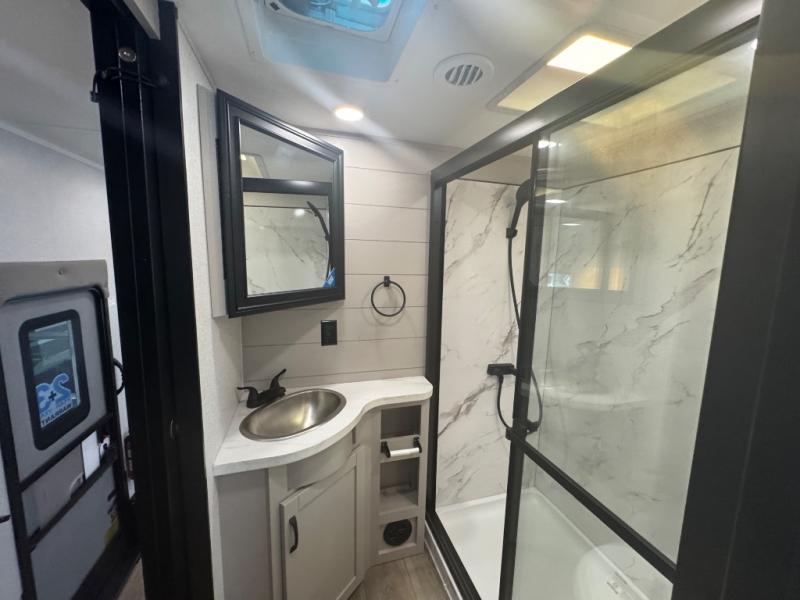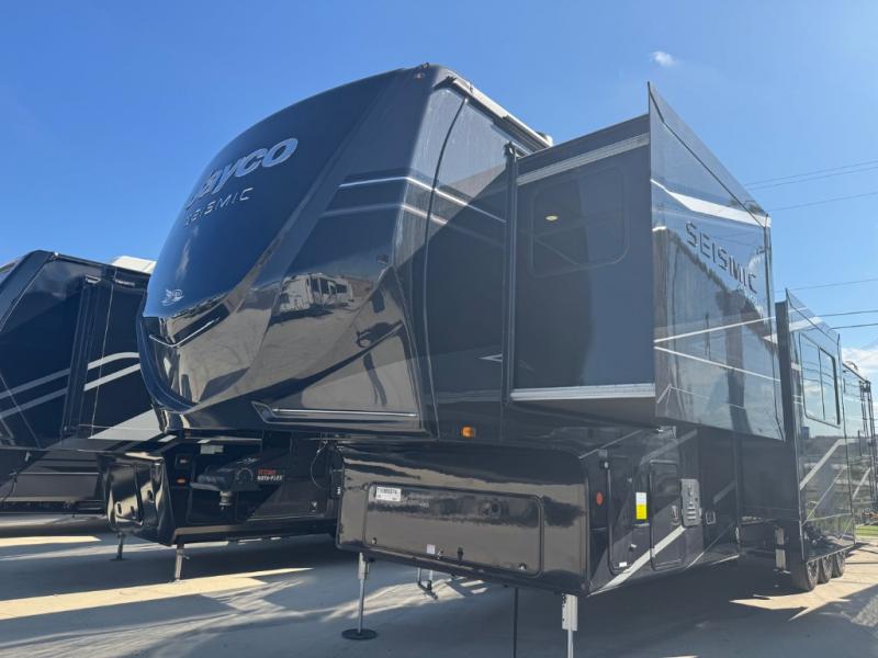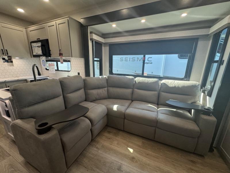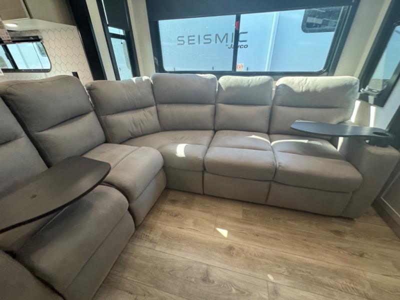 One look at the Seismic toy haulers by Jayco, and you'll never go back! Each model features a custom automotive-grade vinyl exterior graphics package, a painted fiberglass front cap with built-in LED lighting, and 102" wide-body structural steel I-beam construction. You'll find the pass-through storage with Slam-Latch baggage doors will make unpacking easier than ever, and the rear ramp door/patio with anti-slip, non-skid flooring will allow you to unload your toys with no trouble at all. These toy haulers feature a three seasons garage wall/doors, a 30 gallon fuel tank with a timer, and exterior marine-grade speakers to keep the party going. The Climate Shield zero degree tested weather protection includes a 35,000 BTU furnace, PEX plumbing, and a fully enclosed and heated underbelly so you can enjoy your adventures year around. And we haven't even touched on the interior luxuries you'll find, like solid hardwood cabinet doors, residential vinyl flooring made in the USA, night shades, and more!