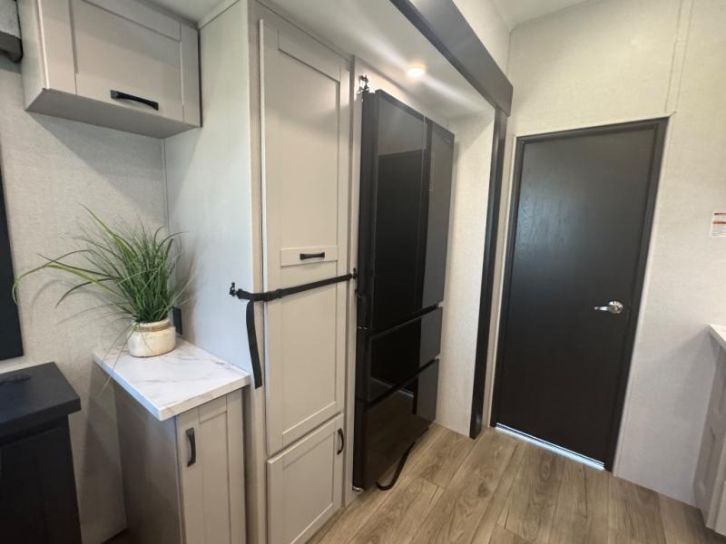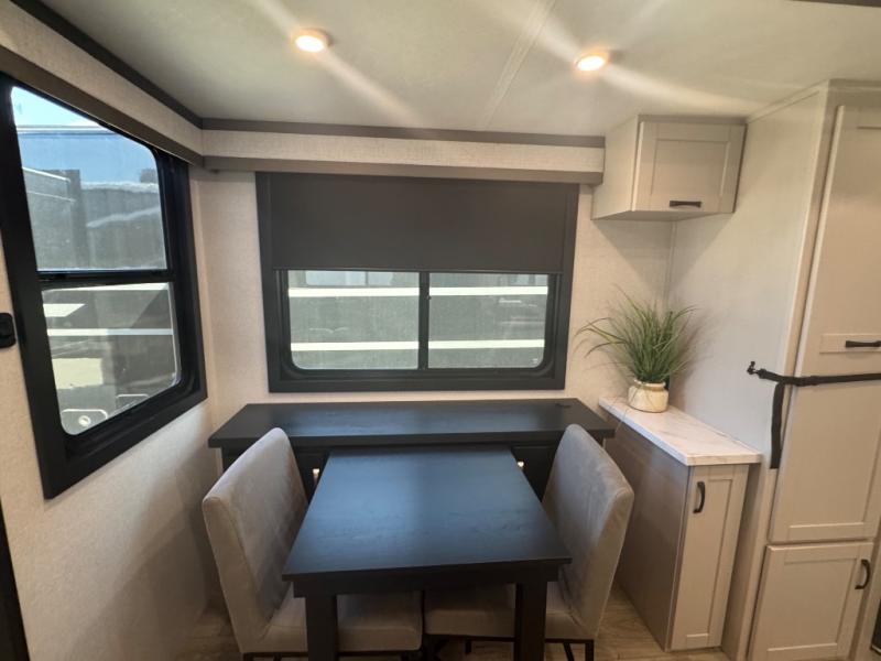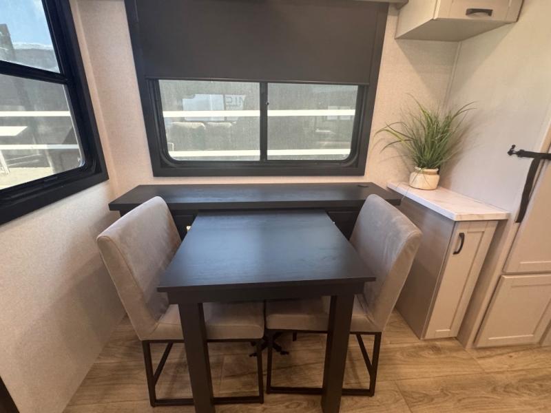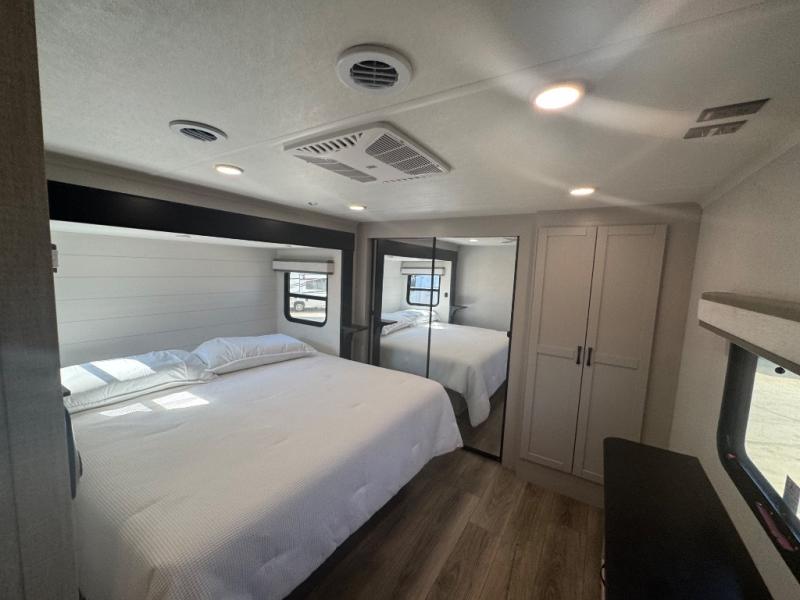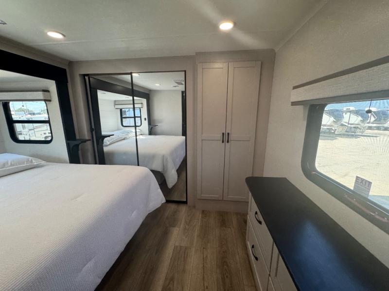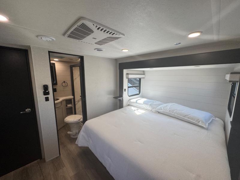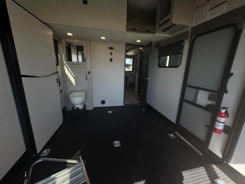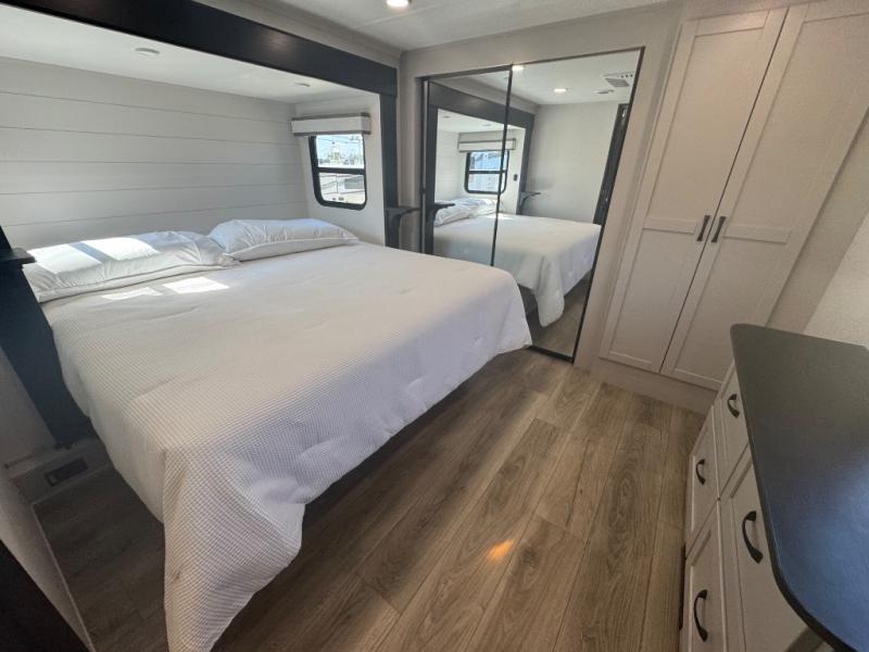 Get ready for outdoor adventures in this spacious toy hauler. Your guests will have the 13' 6" garage with queen bed with convertible sofa and a loft for added sleeping space, plus there is overhead storage for your things and a side man door to come and go easily. The main living area includes dual opposing slides with an L-shaped tri-fold sofa along the roadside and your dinette and refrigerator plus pantry in the curbside slide. Head up the steps to your front private bedroom with the dual entry bath accessible from the hall and inside the master bedroom. Here you will all enjoy a walk-in shower, toilet, and vanity with a sink, plus overhead storage. The bedroom features a third slide out housing a queen bed for added floor space, plus a full front walk-in closet, a dresser, and washer/dryer prep!