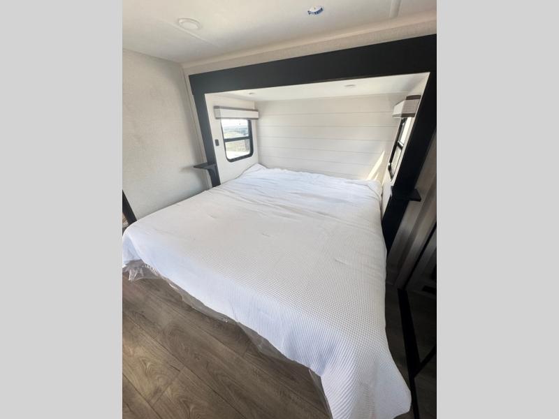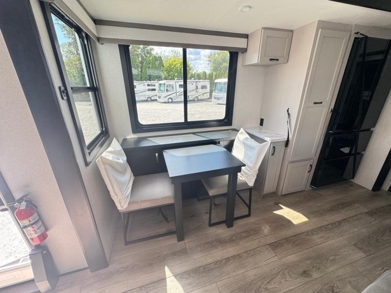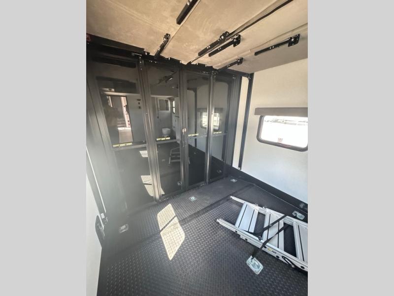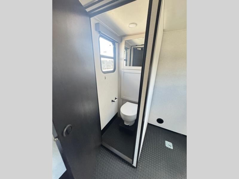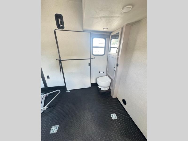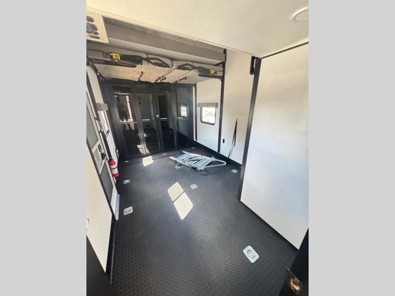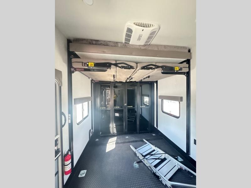 Get ready for outdoor adventures in this spacious toy hauler. Your guests will have the 13' 6" garage with queen bed with convertible sofa and a loft for added sleeping space, plus there is overhead storage for your things and a side man door to come and go easily. The main living area includes dual opposing slides with an L-shaped tri-fold sofa along the roadside and your dinette and refrigerator plus pantry in the curbside slide. Head up the steps to your front private bedroom with the dual entry bath accessible from the hall and inside the master bedroom. Here you will all enjoy a walk-in shower, toilet, and vanity with a sink, plus overhead storage. The bedroom features a third slide out housing a queen bed for added floor space, plus a full front walk-in closet, a dresser, and washer/dryer prep!