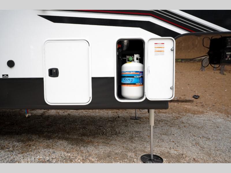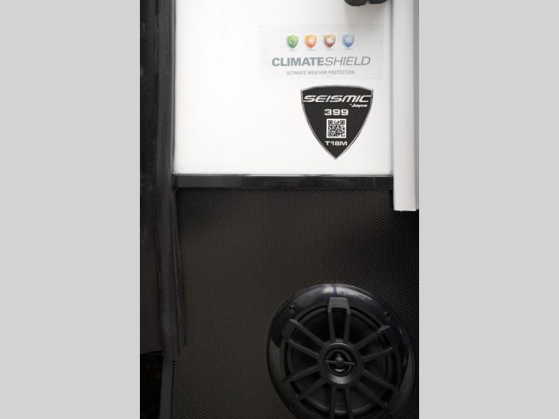 One look at the Seismic toy haulers by Jayco, and you'll never go back! Each model features a custom automotive-grade vinyl exterior graphics package, a painted fiberglass front cap with built-in LED lighting, and 102" wide-body structural steel I-beam construction. You'll find the pass-through storage with Slam-Latch baggage doors will make unpacking easier than ever, and the rear ramp door/patio with anti-slip, non-skid flooring will allow you to unload your toys with no trouble at all. These toy haulers feature a three seasons garage wall/doors, a 30 gallon fuel tank with a timer, and exterior marine-grade speakers to keep the party going. The Climate Shield zero degree tested weather protection includes a 35,000 BTU furnace, PEX plumbing, and a fully enclosed and heated underbelly so you can enjoy your adventures year around. And we haven't even touched on the interior luxuries you'll find, like solid hardwood cabinet doors, residential vinyl flooring made in the USA, night shades, and more!