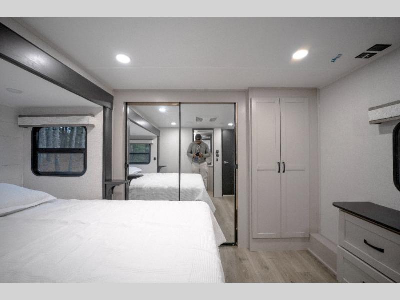 Get ready for outdoor adventures in this spacious toy hauler. Your guests will have the 13' 6" garage with queen bed with convertible sofa and a loft for added sleeping space, plus there is overhead storage for your things and a side man door to come and go easily. The main living area includes dual opposing slides with an L-shaped tri-fold sofa along the roadside and your dinette and refrigerator plus pantry in the curbside slide. Head up the steps to your front private bedroom with the dual entry bath accessible from the hall and inside the master bedroom. Here you will all enjoy a walk-in shower, toilet, and vanity with a sink, plus overhead storage. The bedroom features a third slide out housing a queen bed for added floor space, plus a full front walk-in closet, a dresser, and washer/dryer prep!