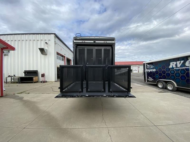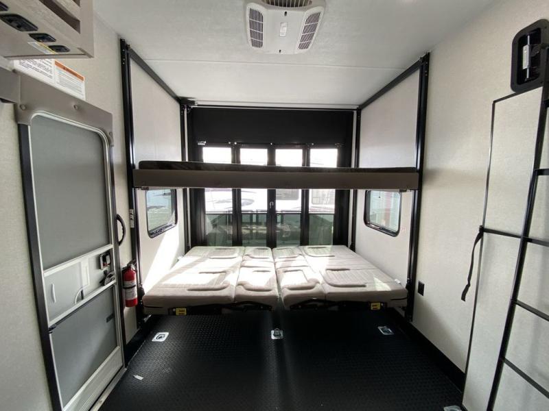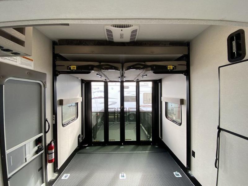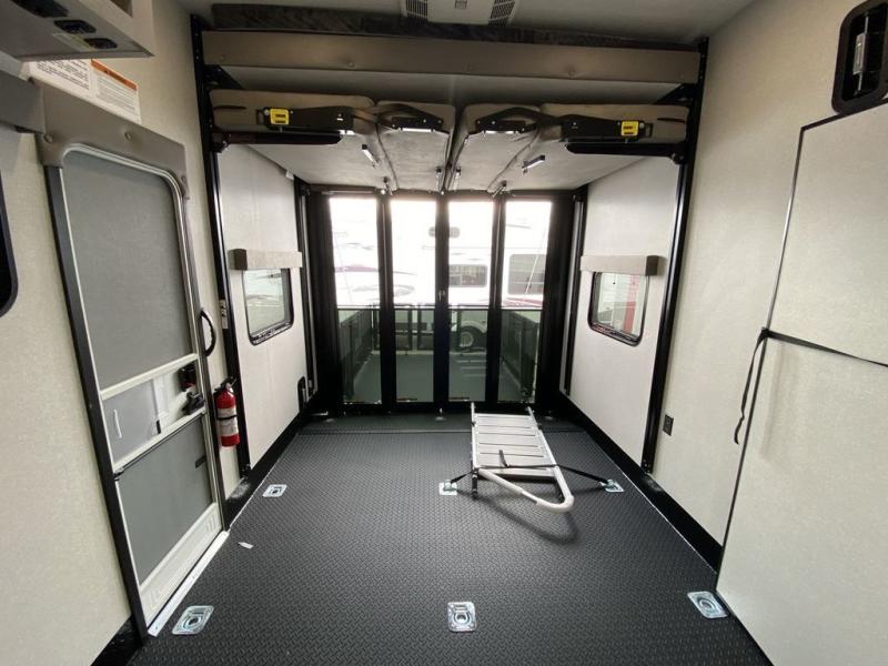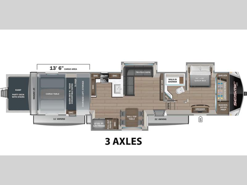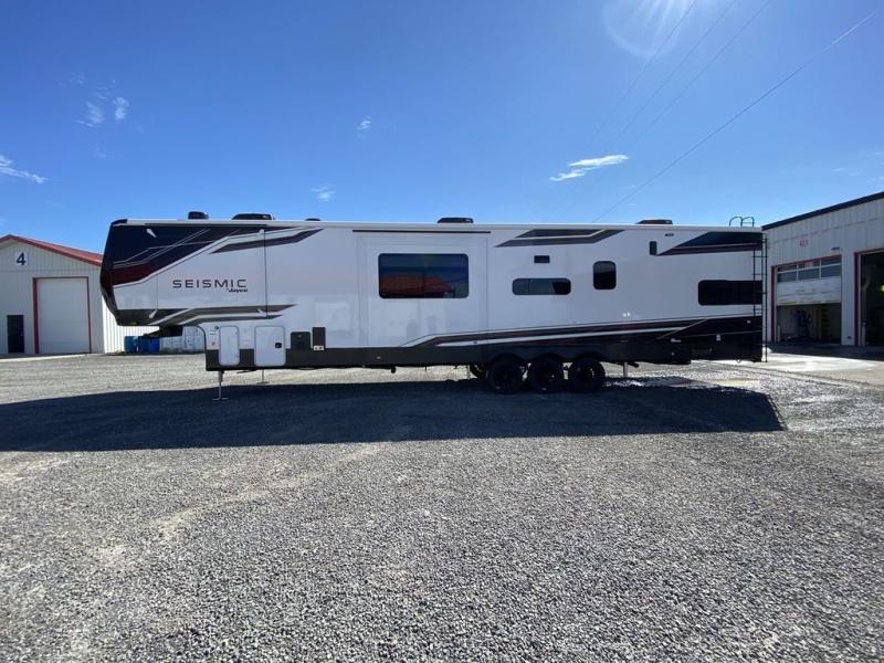 One look at the Seismic toy haulers by Jayco, and you'll never go back! Each model features a custom automotive-grade vinyl exterior graphics package, a painted fiberglass front cap with built-in LED lighting, and 102" wide-body structural steel I-beam construction. You'll find the pass-through storage with Slam-Latch baggage doors will make unpacking easier than ever, and the rear ramp door/patio with anti-slip, non-skid flooring will allow you to unload your toys with no trouble at all. These toy haulers feature a three seasons garage wall/doors, a 30 gallon fuel tank with a timer, and exterior marine-grade speakers to keep the party going. The Climate Shield zero degree tested weather protection includes a 35,000 BTU furnace, PEX plumbing, and a fully enclosed and heated underbelly so you can enjoy your adventures year around. And we haven't even touched on the interior luxuries you'll find, like solid hardwood cabinet doors, residential vinyl flooring made in the USA, night shades, and more!