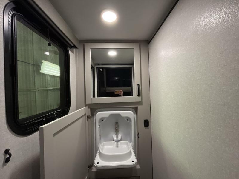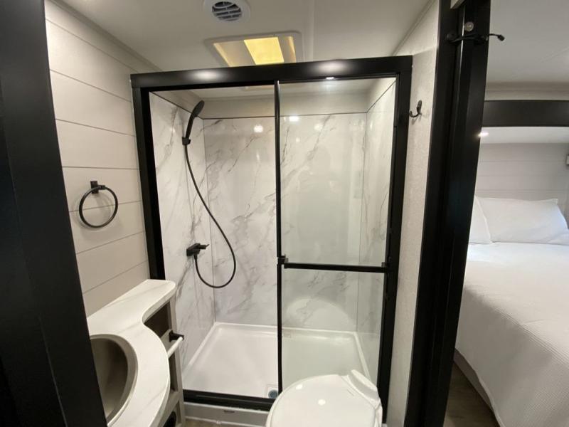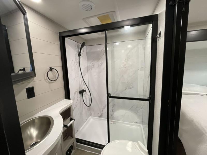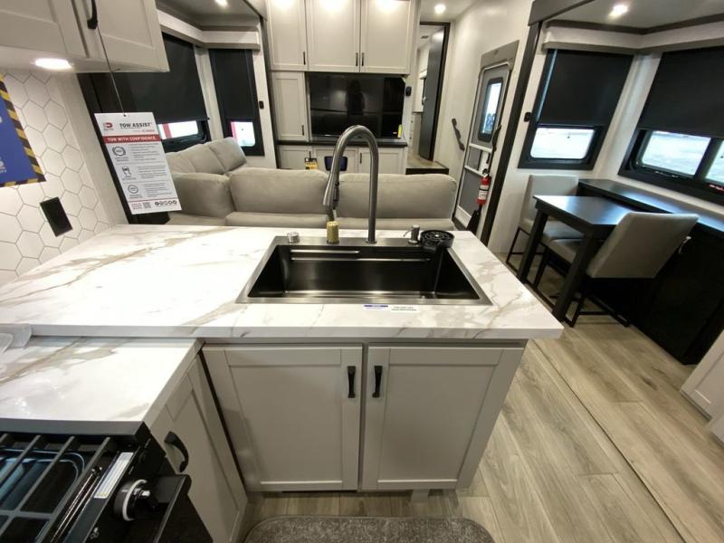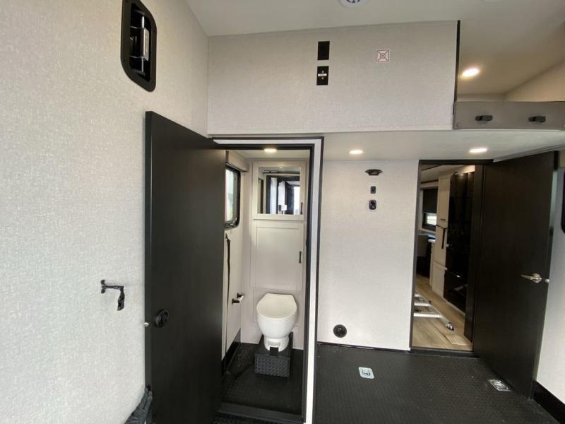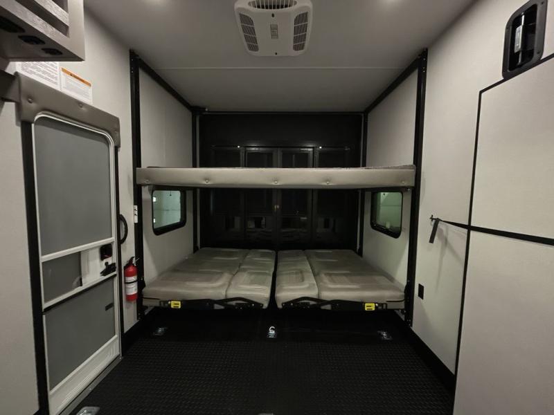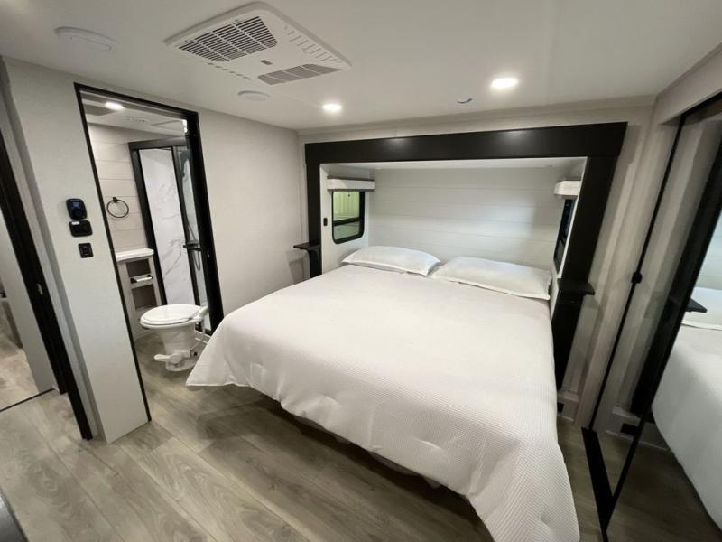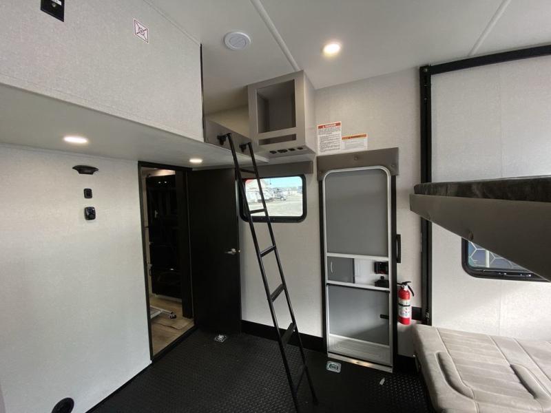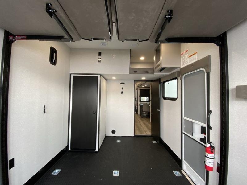 Get ready for outdoor adventures in this spacious toy hauler. Your guests will have the 13' 6" garage with queen bed with convertible sofa and a loft for added sleeping space, plus there is overhead storage for your things and a side man door to come and go easily. The main living area includes dual opposing slides with an L-shaped tri-fold sofa along the roadside and your dinette and refrigerator plus pantry in the curbside slide. Head up the steps to your front private bedroom with the dual entry bath accessible from the hall and inside the master bedroom. Here you will all enjoy a walk-in shower, toilet, and vanity with a sink, plus overhead storage. The bedroom features a third slide out housing a queen bed for added floor space, plus a full front walk-in closet, a dresser, and washer/dryer prep!