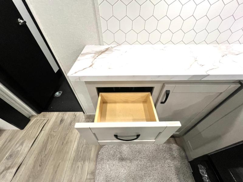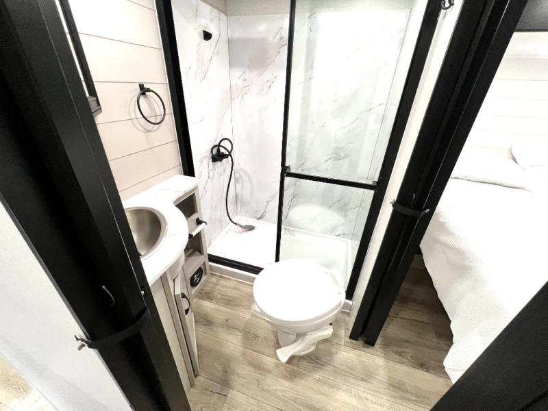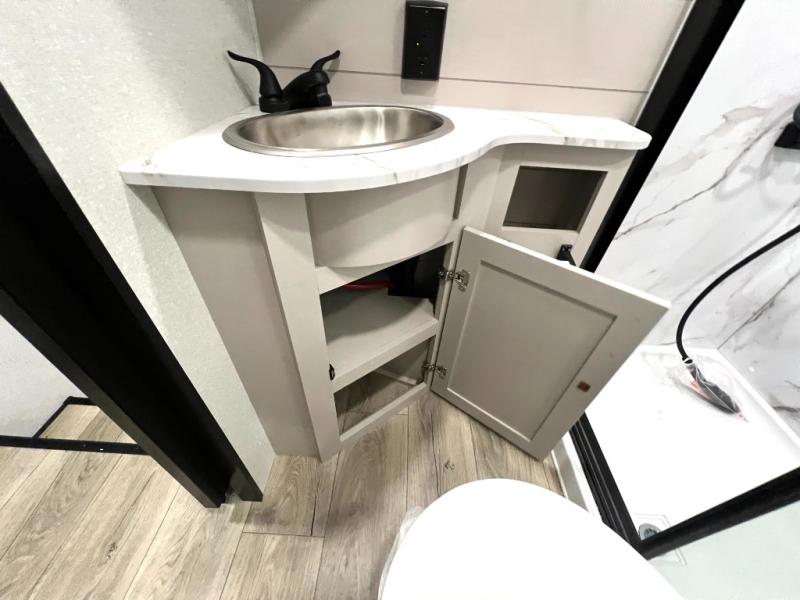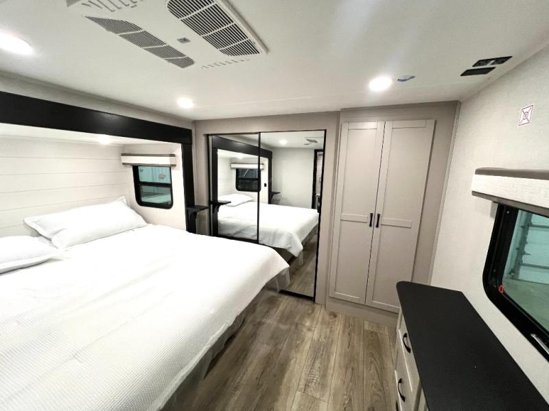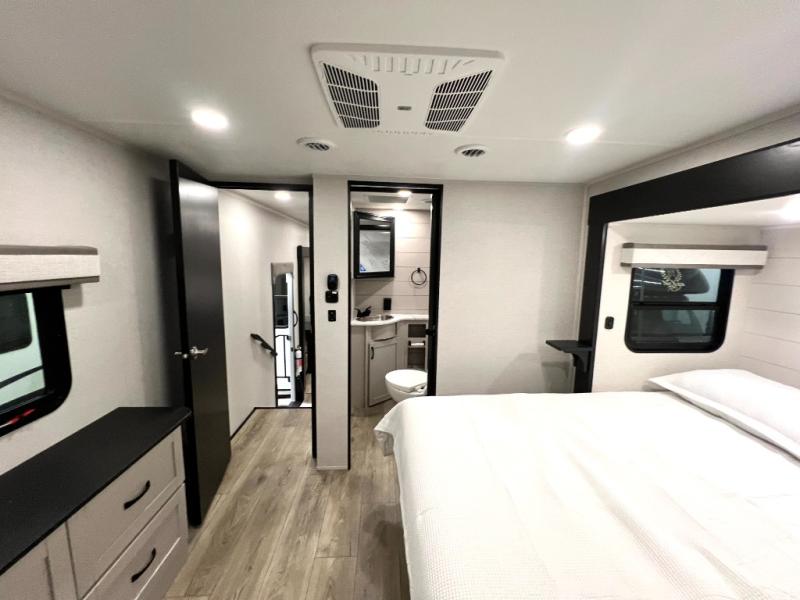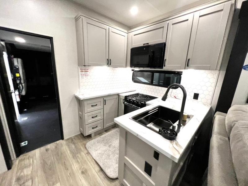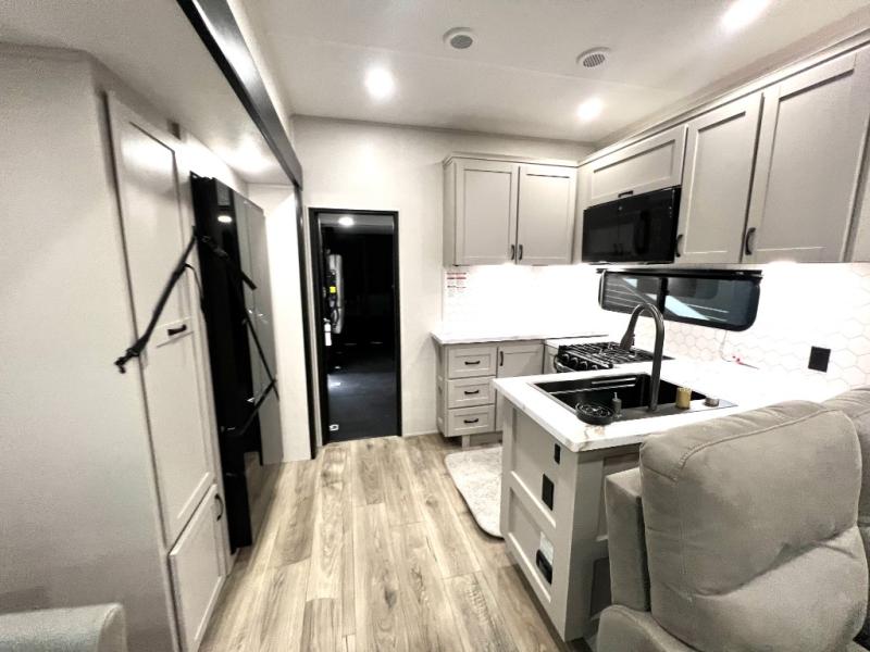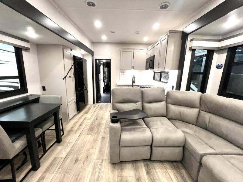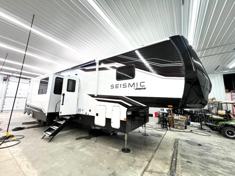 One look at the Seismic toy hauler fifth wheels by Jayco, and you'll never go back! Each model features a custom automotive-grade vinyl exterior graphics package, a painted fiberglass front cap with built-in LED lighting, and 102" wide-body structural steel I-beam construction. You'll find the pass-through storage with Slam-Latch baggage doors will make unpacking easier than ever, and the rear ramp door/patio with anti-slip, non-skid flooring will allow you to unload your toys with no trouble at all. These toy haulers feature a three-season garage wall/doors, a 30-gallon fuel tank with a timer, and exterior marine-grade speakers to keep the party going. The Climate Shield zero degree tested weather protection includes a 35,000 BTU furnace and a fully enclosed and heated underbelly for better protection against the elements. And we haven't even touched on the interior luxuries you'll find, like solid hardwood cabinet doors, residential vinyl flooring made in the USA, night roller shades, and more!